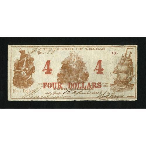 <B>St. Joseph, LA- Parish of Tensas </B></I>$4 April 15, 1862<BR> Printed in bold red ink, this fully issued note has quite a bit of appeal. A portion of a stamp hinge is noted on back and there are some minor pinholes. <B>Very Good-Fine.</B></I><BR><I>From The Collection of a Louisiana Gentleman</B></I><BR><BR><b>Shipping:</b> Coins & Currency (<a target="_blank" href="http://www.heritageauctions.com/common/shipping.php">view shipping information</a>)