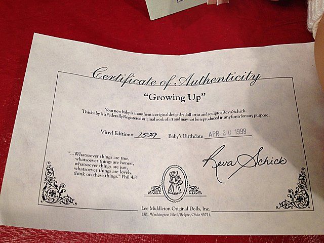 To Benefit St. Jude Children's Research Hospital; "Growing Up" doll by Lee Middletown Original Dolls, Inc., Measures approx. 20" tall. Owner reportedly paid over $200 for this doll when originally purchased. This doll is being auctioned to benefit St. Jude Children's Research Hospital. We have been collecting for St. Jude Children's Research Hospital since the passing of Peter W. Chapulis, in his memory. We are proud to announce that we have raised $57,500.00 to date for St. Jude Children's Research Hospital! We thank all of our loyal customers for helping to make this happen! This is your opportunity to give a child or doll collector a wonderful collector's doll and give to the children of St. Jude Children's Research Hospital at the same time!