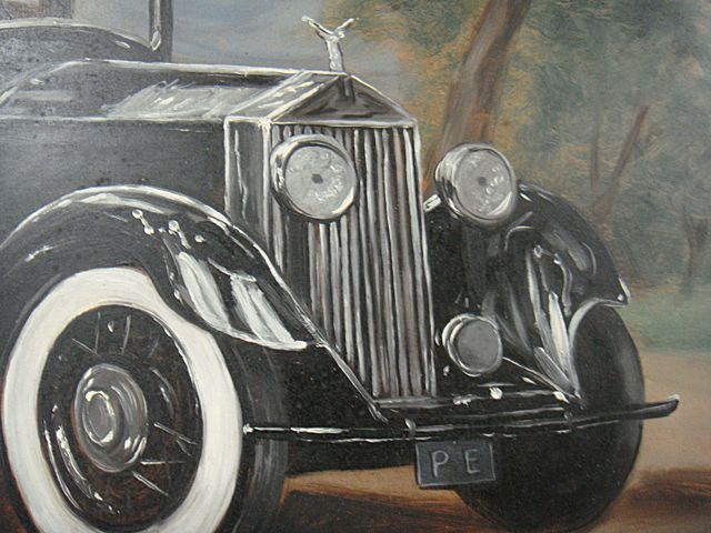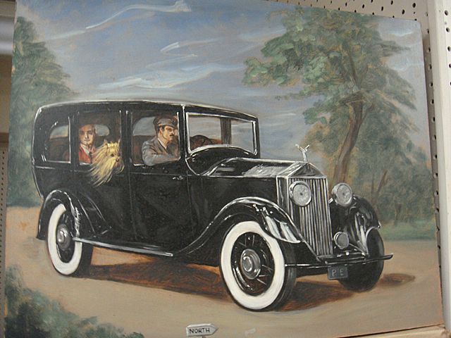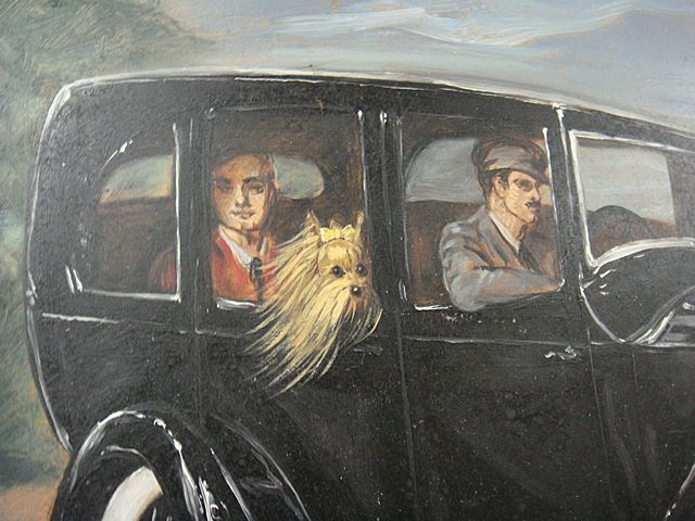 To Benefit St. Jude Children's Research Hospital; R.L. Anderson, listed American Artist from Litchfield, CT, painting on board. Painted in Litchfield, CT studio. This painting was done as an illustration for a book on Yorkshire Terriers. Reportedly is Mr. Anderson, as self portrait, in the back of this vintage automobile. This item is being auctioned to benefit St. Jude Children's Research Hospital. We have been collecting for St. Jude Children's Research Hospital since the passing of Peter W. Chapulis, in his memory. We are proud to announce that we have raised $57,500.00 to date for St. Jude Children's Research Hospital! We thank all of our loyal customers for helping to make this happen! This is your opportunity to give a great gift and give to the children of St. Jude Children's Research Hospital at the same time!