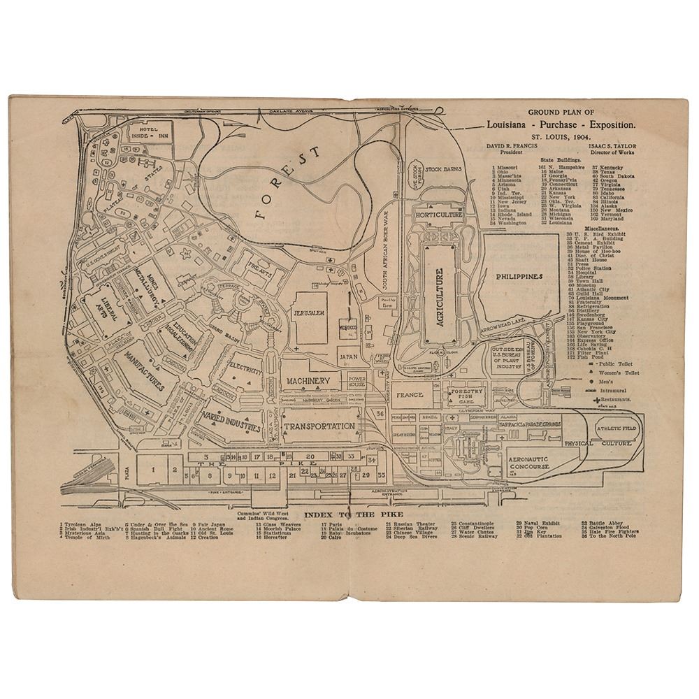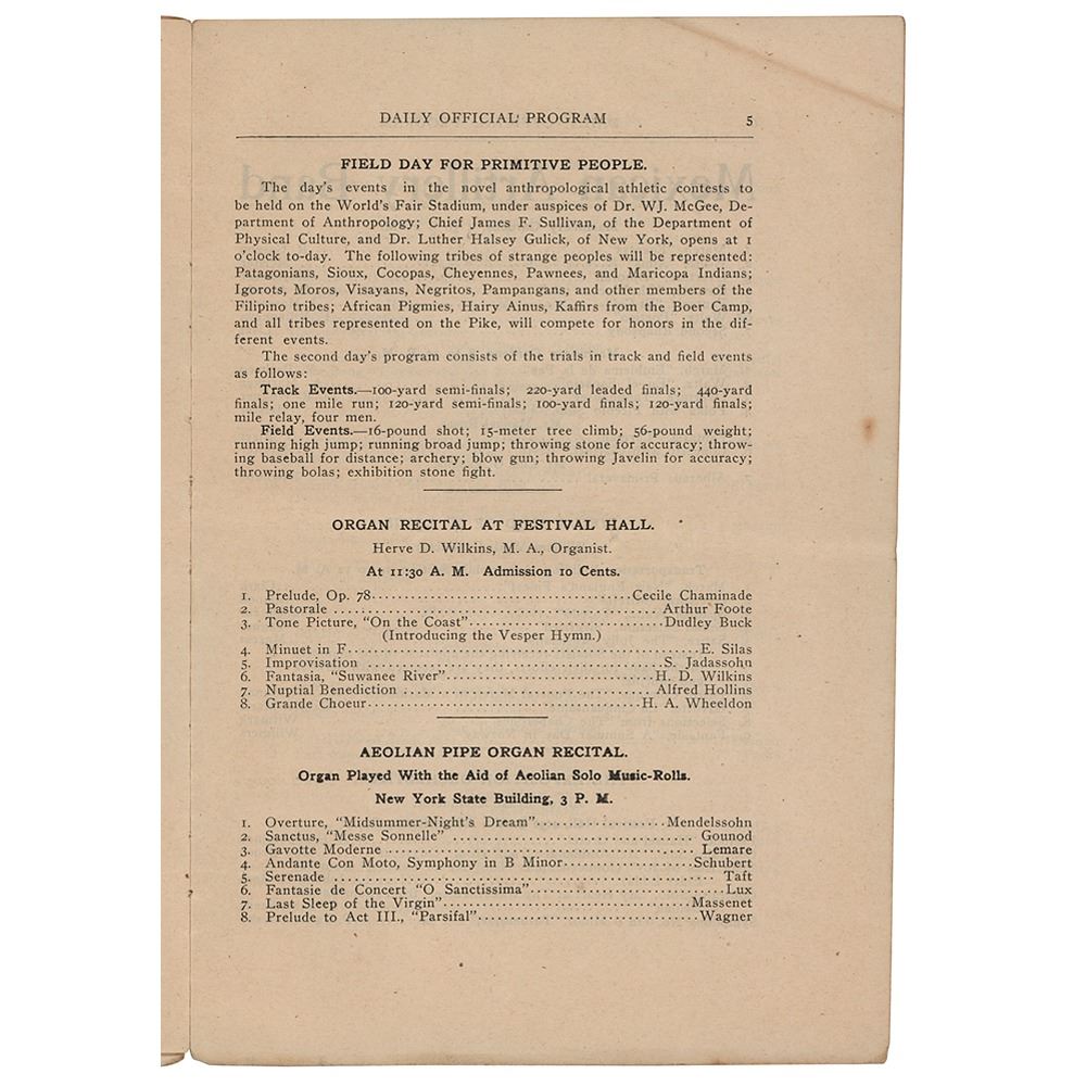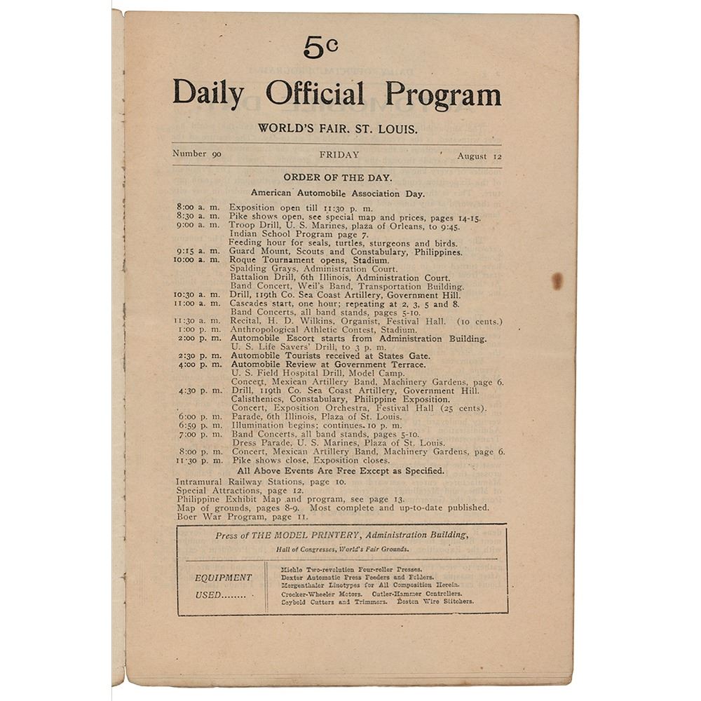 Daily official program for the World's Fair or Louisiana Purchase Exposition in St. Louis on August 12, 1904, which played host to that year's Olympic Games, 16 pages, 6 x 9, providing schedules and descriptions of the day's diverse events, which includes: “Feeding hour for seals, turtles, sturgeons, and birds,†“Anthropological Athletic Contest,†“U.S. Life Savers’ Drill,†and more. The upcoming Olympic events is listed on last page. In very good to fine condition, with a horizontal fold, and wear and toning to covers. Of considerable interest is the mention of the controversial Anthropology Days event held on August 12–13, some two weeks before the opening ceremony. Indigenous men from around the world, attending the World's Fair as part of the Department of Ethnology exhibits, participated in physical displays alongside cultural presentations as a means for anthropologists to see how they compared to their white counterparts.