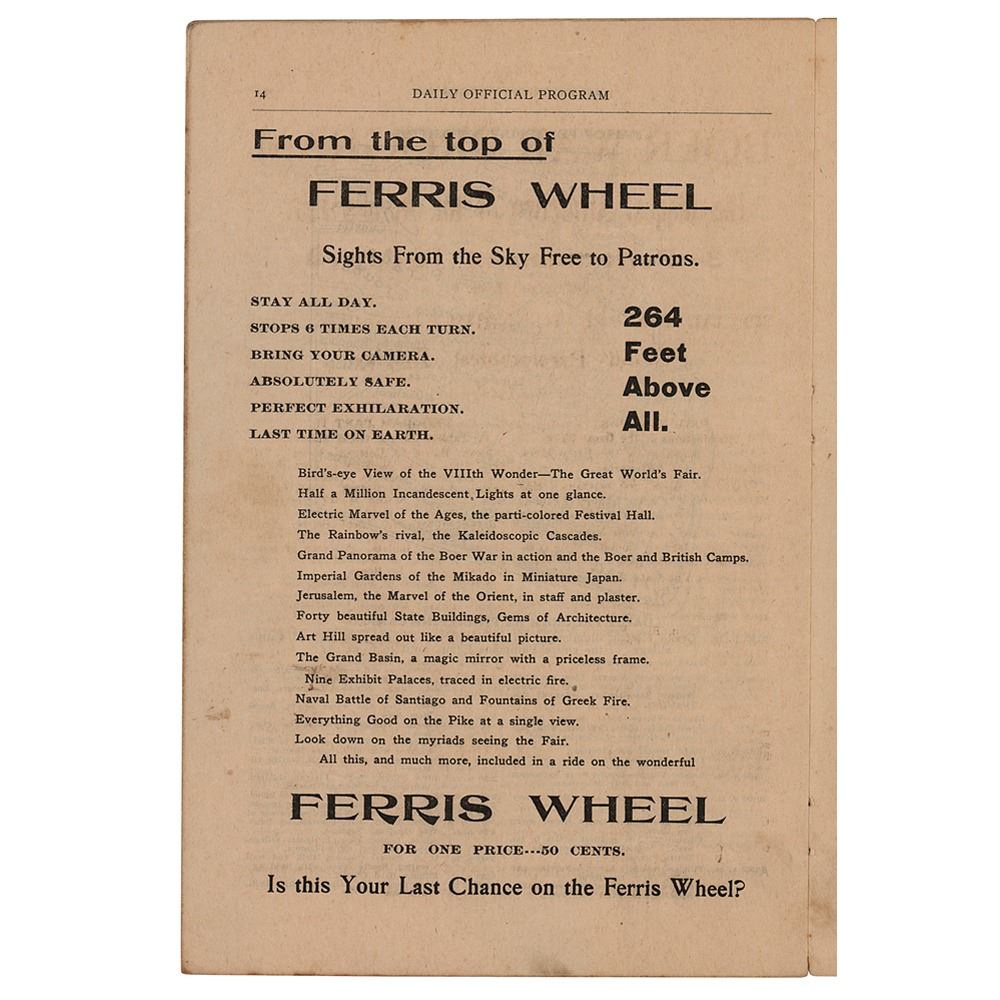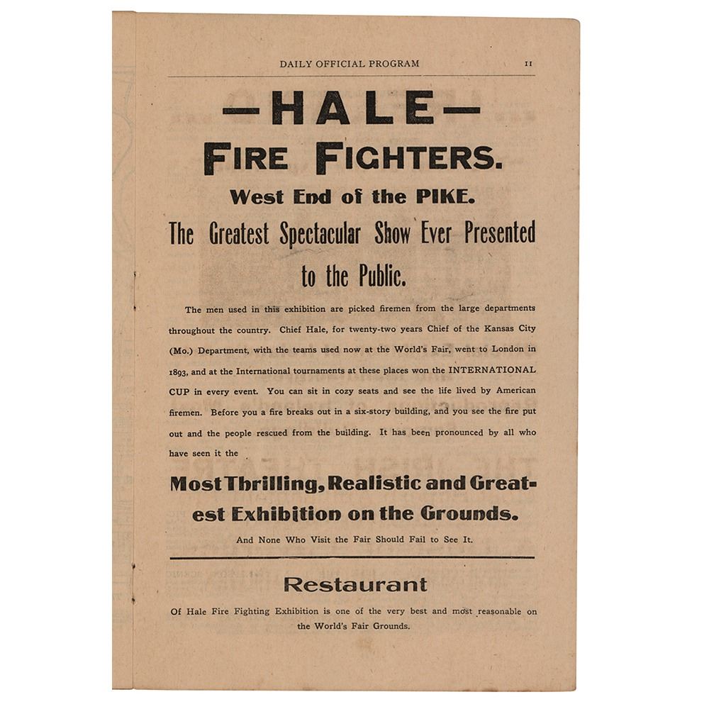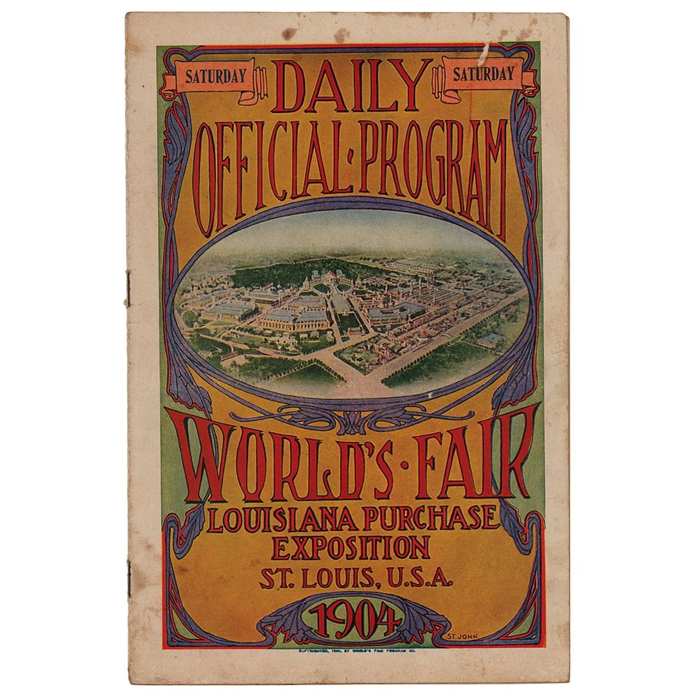 Daily official program for the World's Fair or Louisiana Purchase Exposition in St. Louis on October 15, 1904, which played host to that year's Olympic Games, 16 pages, 6 x 9, providing schedules and descriptions of the day's diverse events, which includes: “Demonstration of Automatic Car Fender,†“U.S. Life Savers’ Drill,†and more. The program also features advertisements for the “Hale, Fire Fighters†and for the original Ferris Wheel, which had been built for the 1893 World's Columbian Exposition in Chicago, then transported to St. Louis for the Louisiana Purchase Exposition. Although unlisted, the Olympic wrestling championships were held on October 14 and 15. In very good to fine condition, with light staining to the covers, edgewear, and vertical folds.