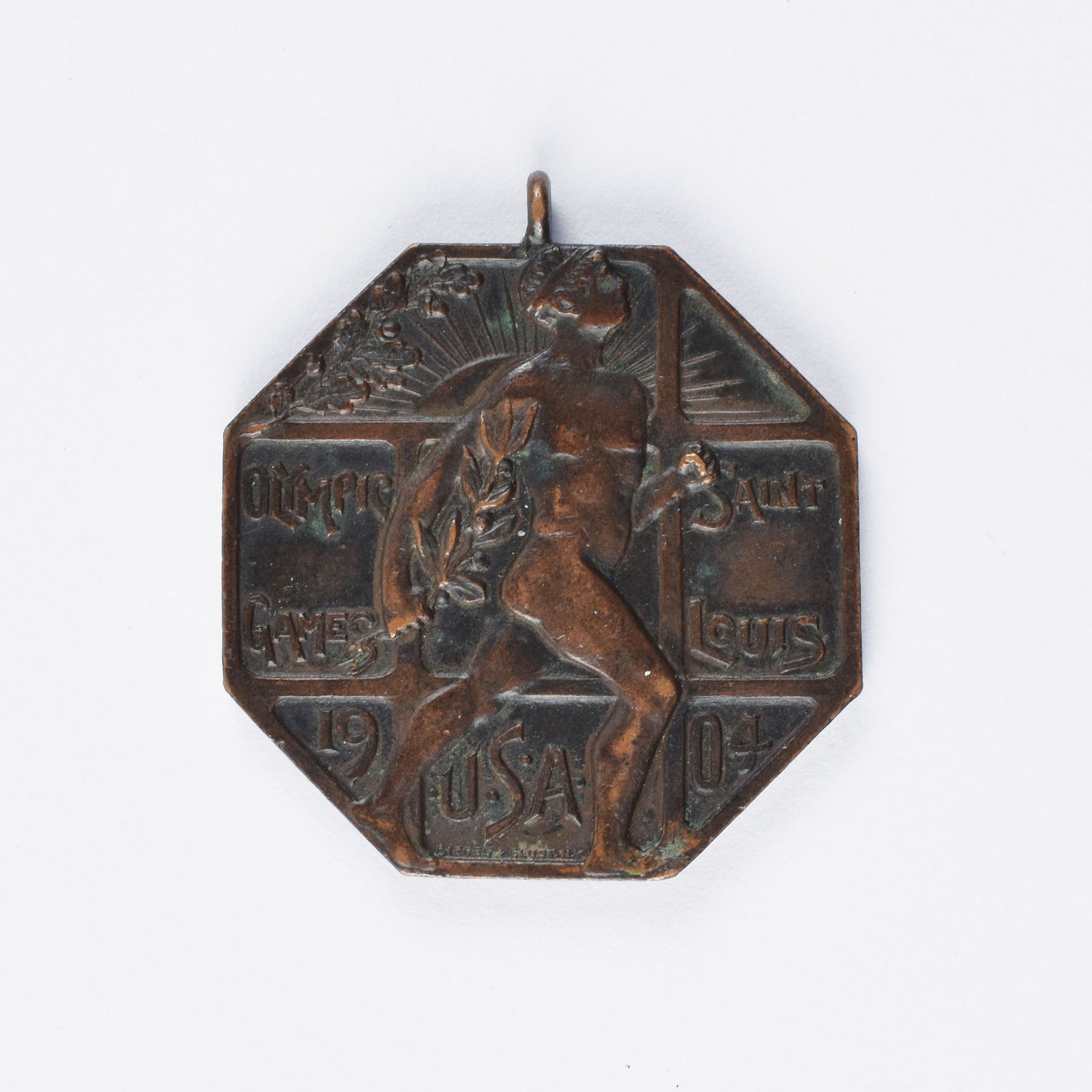 Extremely rare official's participation medal issued for the St. Louis 1904 Summer Olympics. Copper, 40 mm, 30 gm, by Dieges & Clust, New York. The front, inscribed, "Olympic Games, St. Louis, USA, 1904," features an idealized nude athlete mid-stride with a laurel branch in his hand; the reverse features the lengthy text, "1803, Universal Exposition Commemorating the Olympic Games, 1904, Physical Culture Department, Frederick J. V. Skiff, Director of Exhibits," encircled by ivy leaves with the shield emblems of St. Louis, France, and USA. Topped with a loop, this type of medal was originally suspended from a colorful ribbon and issued only to officials; those issued to athletes were identical, but lacked the loop and instead had an entirely plain edge. This is a beautiful example with a handsome, dark patina. The 1904 St. Louis is the rarest and most coveted of all Olympic participation medals.
