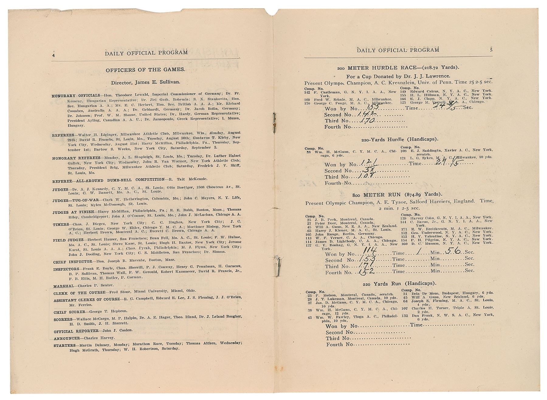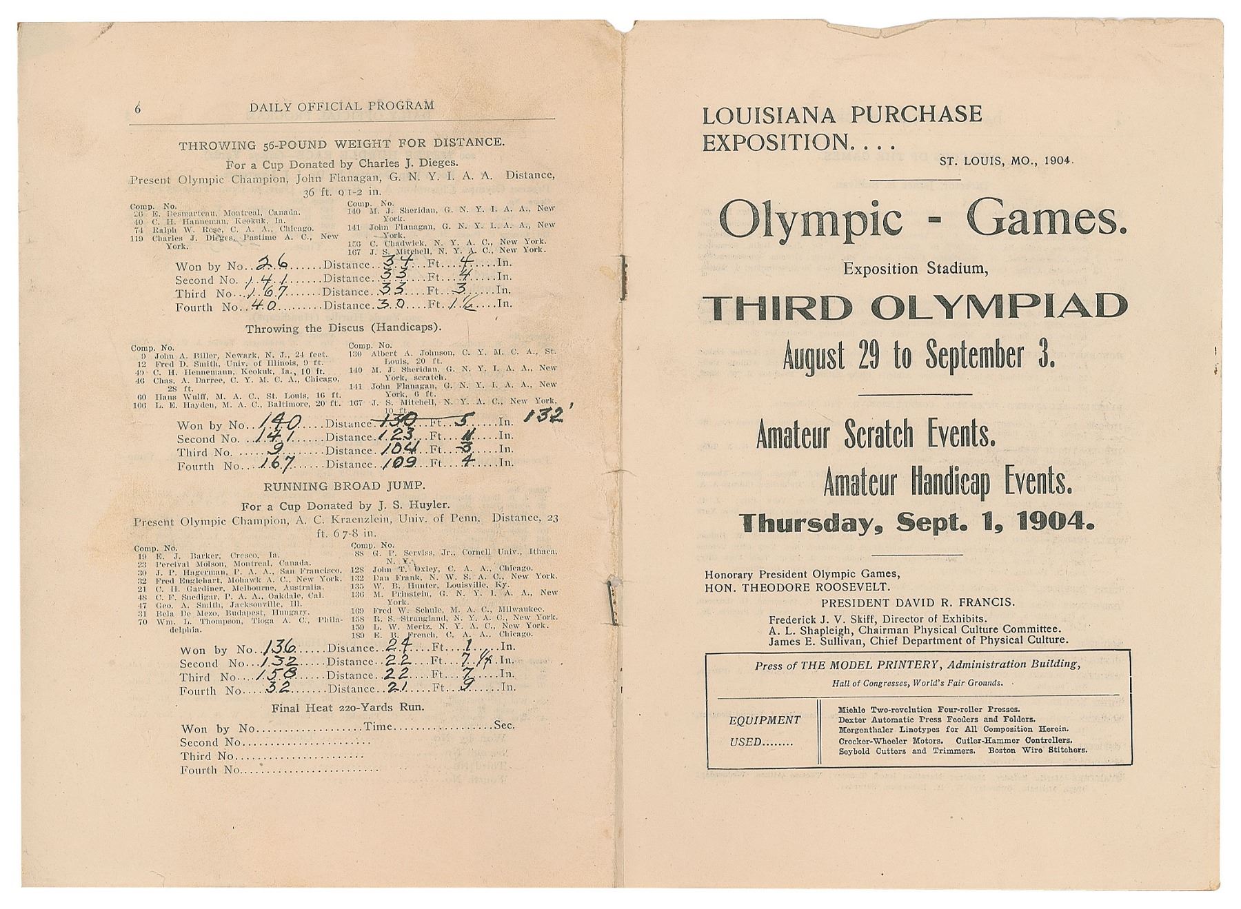 Rare incomplete daily official program for the events of the St. Louis 1904 Summer Olympics held on September 1st, four pages, 6.25 x 9, listing the day's events as "200 Meter Hurdle Race," "220-Yards Hurdle," "800 Meter Run," "220 Yards Run," "Throwing 56-Pound Weight for Distance," "Throwing the Discus," and "Running Broad Jump." Six of the event sections were annotated in ink by a spectator, denoting winning athletes' numbers and results. In fine condition, with light handling wear and the covers (comprising pages 1–2 and 7–8) absent. Accompanied by photocopies of the absent pages sourced from a complete example.