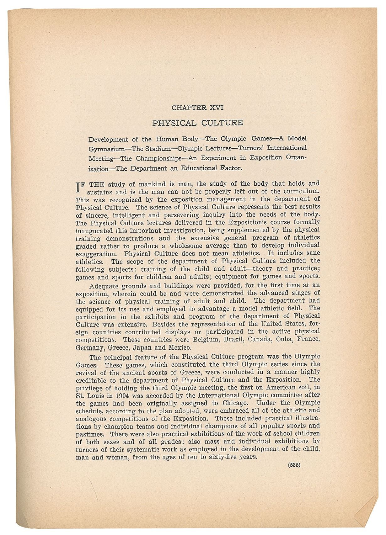 Two books: The Universal Exposition of 1904 by David R. Francis, Volumes I and II. First edition. St. Louis: Louisiana Purchase Exposition Company, 1913. Hardcover, 8 x 11, totaling 1130 pages. The comprehensive books document and illustrate all aspects of the St. Louis World's Fair, which played host to the 1904 Summer Olympics. The Games are discussed briefly in Chapter XVI, "Physical Culture," beginning: "The principal feature of the Physical Culture program was the Olympic Games." In good to very good condition, with edgewear, bumped corners, fraying at spine ends, cracked hinges, title page of first volume detached but present, and large chips to endpapers and the frontispiece of the first volume.