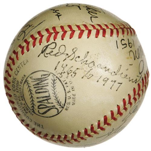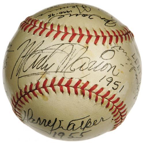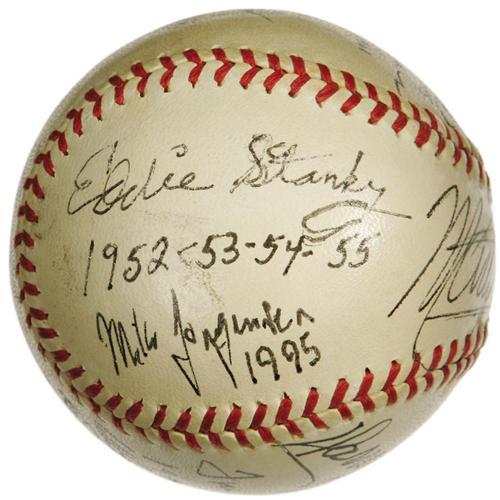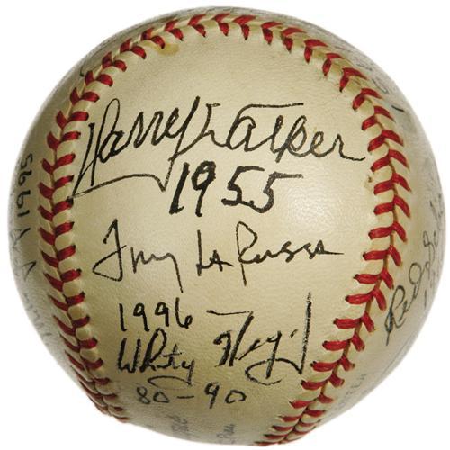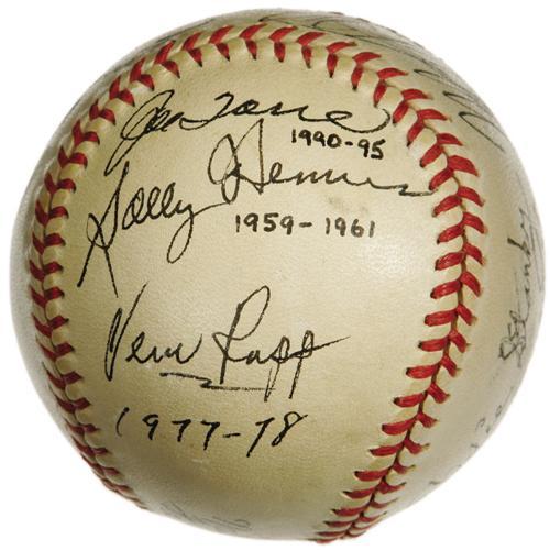 <B>St. Louis Cardinals Managers Multi-Signed Baseball.</B></I> Almost certainly the only one of its kind, this ONL (Frick) ball represents a labor of love accomplished over several decades by one devoted fan. The project apparently began with a sweet spot signature from Marty Marion and continued on from there, through Eddie Stanky, Harry Walker, Solly Hemus, Red Schoendienst, Vern Rapp, Whitey Herzog (traced over), Joe Torre, Mike Jorgensen and Tony LaRussa. Each skipper has notated his signature with his years of service to the red birds, with LaRussa simply listing his first season at the helm (note that Torre and Hemus' dates are in another hand). Wisely, the collector encouraged the use of a similar black ink pen for all signers, and each autograph remains in marvelous 9/10 and better condition. The ball exhibits fairly consistent toning, with a few negligible spots of foxing at the sweet spot. A special opportunity for the advanced Cardinals collector. <I>LOA from PSA/DNA. LOA from James Spence Authentication.</B></I><BR><BR><b>Shipping:</b> Balls, etc. (<a target="_blank" href="http://www.heritageauctions.com/common/shipping.php">view shipping information</a>)
