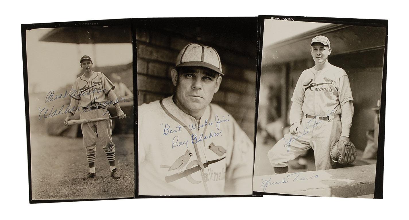 Three semi-glossy heavyweight photos, 5 x 7, all made from the original negatives, each signed in ballpoint by the respective Cardinal pictured. Signers are: Walker Cooper, Ray Blades, and ‘Spud’ Davis, who has signed his photo twice. In fine overall condition, with a few light bends and surface marks.