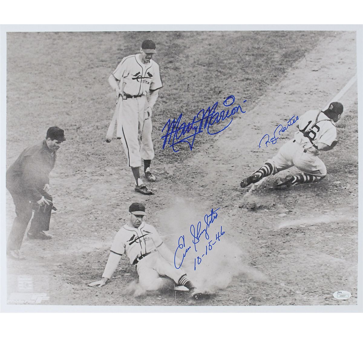 Glossy 20 x 16 photo of the famous ‘Mad Dash’ during the 1946 World Series, signed in blue felt tip by Marty Marion, Enos Slaughter, and Roy Partee. In fine condition, with a James Spence authentication label affixed to lower corner. Accompanied by a certificate of authenticity from James Spence.