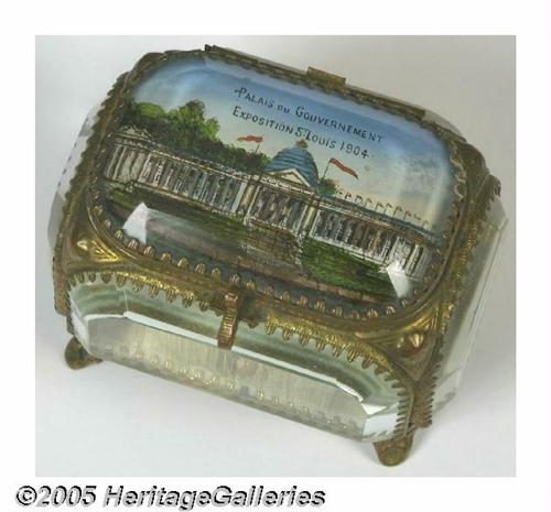 <B>St. Louis Exposition Hand-painted Trinket Box</B></I> This is a real treasure. There are no other offerings in exposition or World's Fair souvenirs that are quite as delicate and ornate as those from the 1904 fair in St. Louis. This 3.5" x 2.25" glass souvenir box pictures a detailed hand-painted picture of the "Palais du Gouvernement" on the lid. The Government Palace was seldom used or depicted on these, or perhaps, a more memorable building was just the souvenir of choice. Excellent condition, complete with latch and some of the interior lined material intact. Lot:254