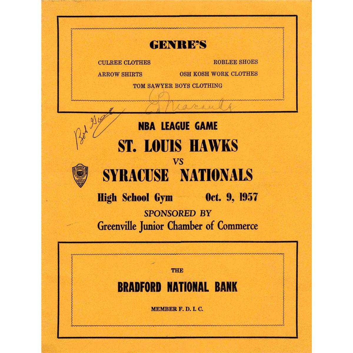 St. Louis Hawks vs. Syracuse Nationals Program -- 9 October 1957 -- Signed by ''Easy'' Ed Macauley -- Cover Folds -- Very Good