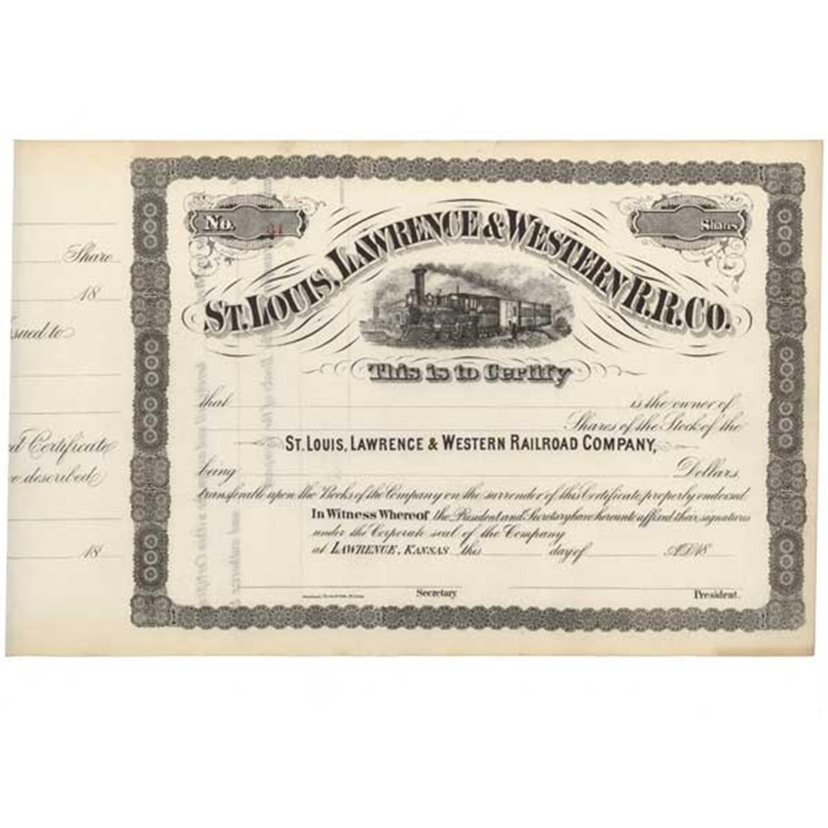 18--, Kansas. Unissued stock certificate. Black / White. Vignette of a locomotive at top center. Ornate border.