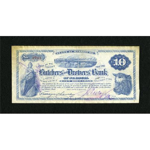 <B>St. Louis, MO- Butchers' & Drovers' Bank of St. Louis </B></I>$10 August 1, 1880<BR> It has been six years since we last offered one of these. A great panoramic view of Eads Bridge is the central vignette. The bridge had just opened up six years previously. This <B>Crisp Uncirculated </B></I>"note" shows some aging around the edges and pinholes.<BR><BR><b>Shipping:</b> Coins & Currency (<a target="_blank" href="http://www.heritageauctions.com/common/shipping.php">view shipping information</a>)
