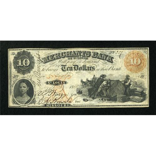 <B>St. Louis, MO- Merchants Bank at Os(c)eola Branch</B></I> $10 Oct. 1, 1859 UNL<BR> This is believed to be a genuine note on this bank, but the winning bidder will make the ultimate call on that. Every note that is listed in Haxby for the Merchants is listed as SENC, "Surviving Example Not Confirmed." Also, the only pictured note for the bank in Haxby is a spurious $5 that uses the same design as this $10. This is the second time that we have had this design in any of our auctions and that earlier VG note brought $299. <B>Fine+.</B></I><BR><I>From The Collection of a Louisiana Gentleman</B></I><BR><BR><b>Shipping:</b> Coins & Currency (<a target="_blank" href="http://www.heritageauctions.com/common/shipping.php">view shipping information</a>)