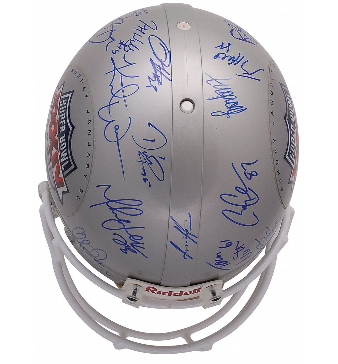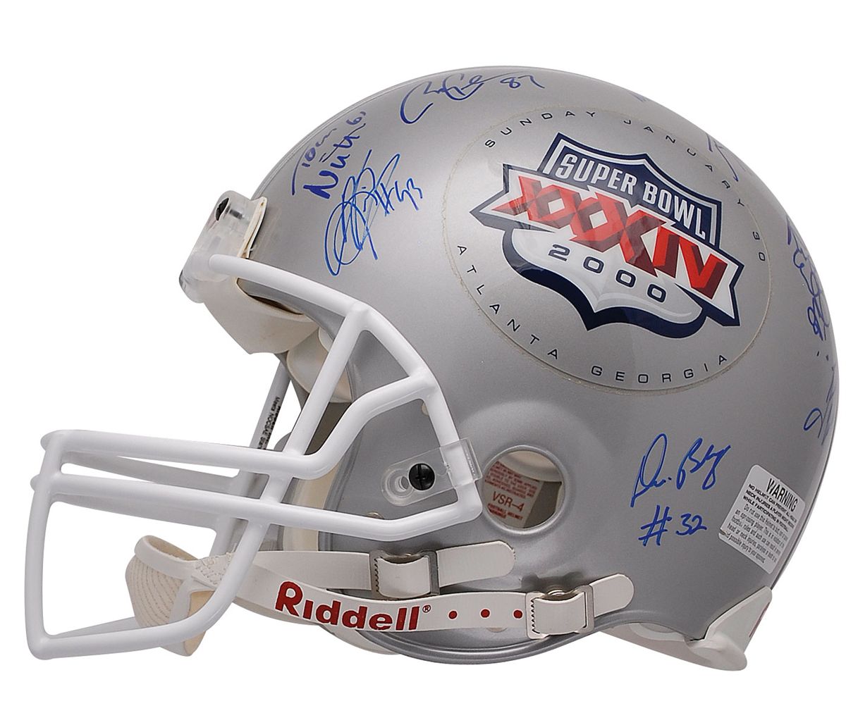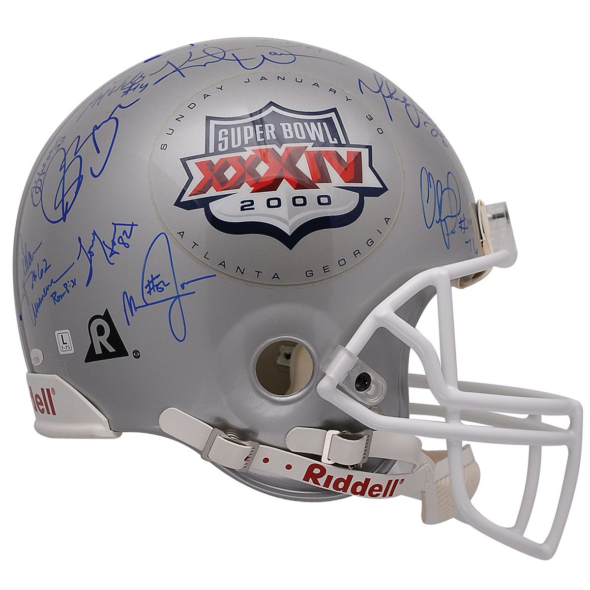Official Riddell Super Bowl XXXIV commemorative football helmet signed in blue felt tip on the sides by 21 members of the 2000 Super Bowl champion Rams. Signers are: Kurt Warner, Marshall Faulk, Isaac Bruce, Torry Holt, London Fletcher, Orlando Pace, D’Marco Farr, Mike Jones, Az Hakim, Tom Nutten, Kevin Carter, Ricky Proehl, Roland Williams, Grant Wistrom, Adam Timmerman, Jusyin Watson, Tony Horne, Jeff Wilkins, Robert Holcrombe, Devon Bush, and Dre Bly. In fine condition.