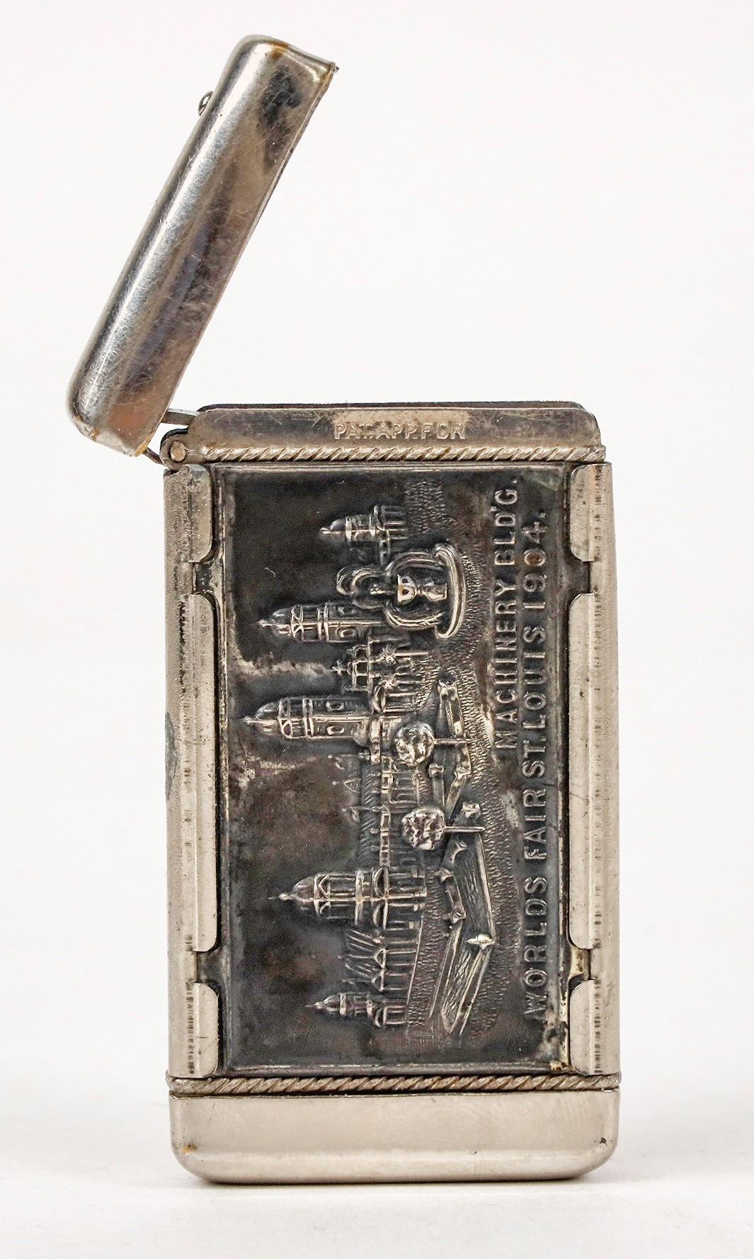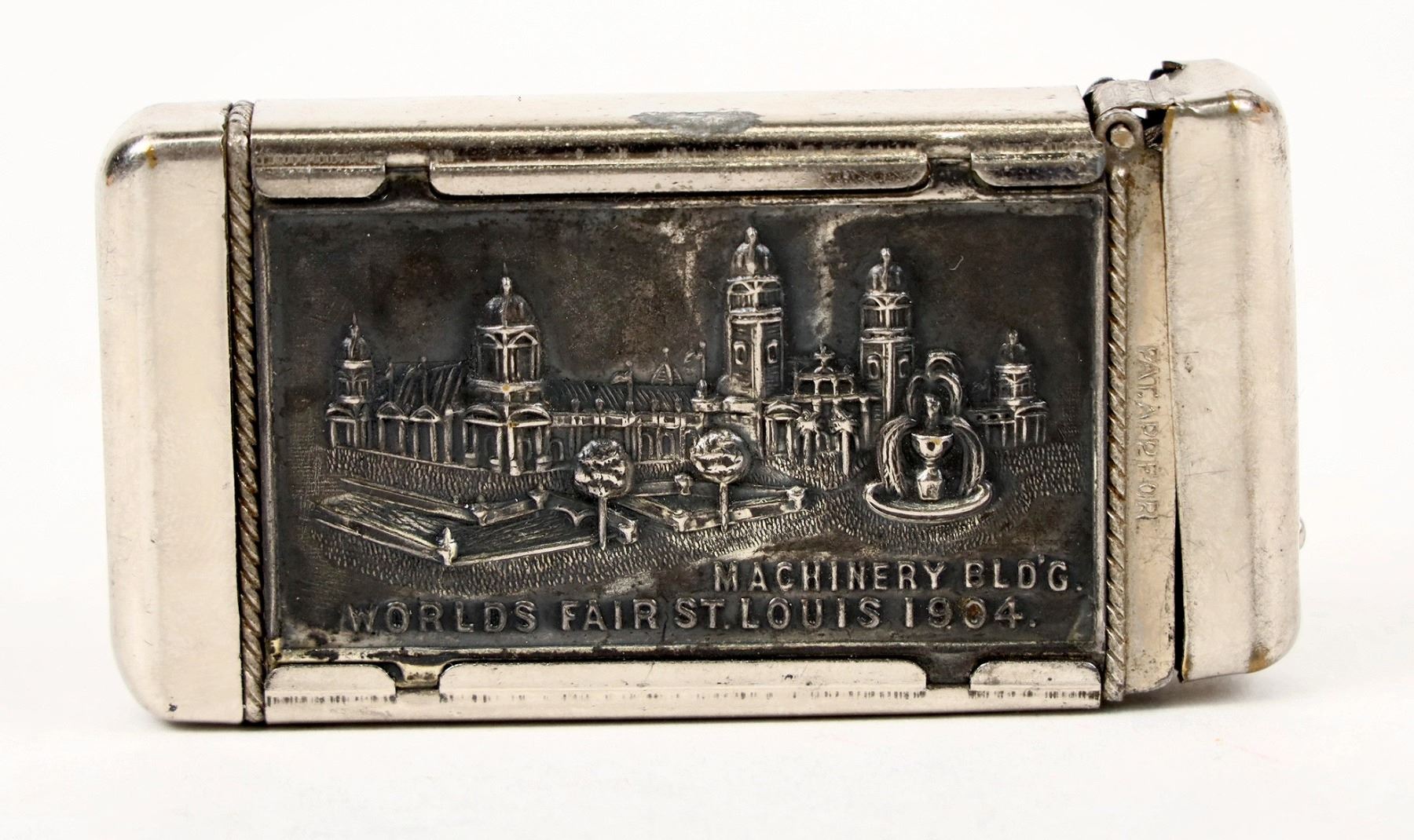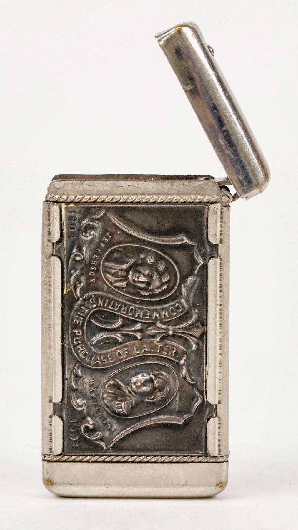 Metal match box, 3 x 1 1/2 inches from the 1904 Louisiana Exposition. Commemorating the purchase of the Louisiana Territory, portraits of Jefferson and Napoleon on one side; the Machinery Building at the World's Fair on the other.
