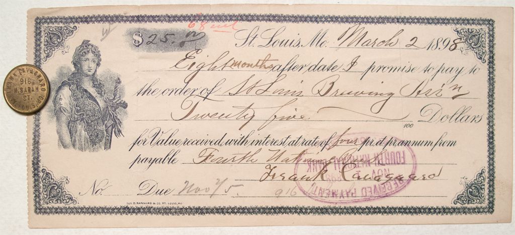 Token from Frank Cavagnaro [brewery] of 916 N. Sarah Street, St. Louis. It was good for 2 1/2 cents. 1898 Receipt from Cavagnaro to the St Louis Brewing Association.