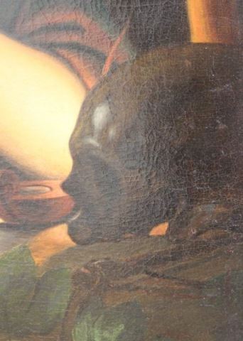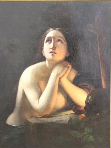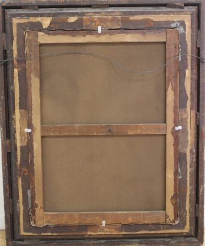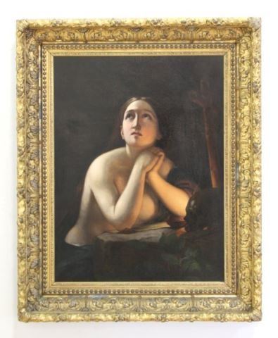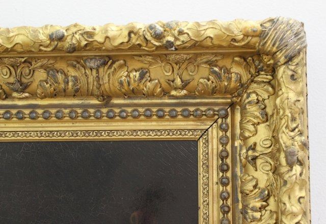 Oil on canvas. Mounted in magnificent gilt carved frame. 19th century. Approx. 33 1/2" H x 25 1/2" W image, 43 1/2" H x 35 1/4" W framed.