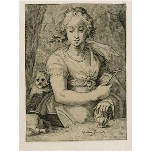 Engraving of Sainte Marie Madeleine signed Matham. Marie Madeleine is wearing pearls and is dressed in clothes contemporary to the artist. She holds a crucifix on one hand and a box of ointments on the other, symbols often found in Mary Magdalen portraits. Jacob Matham (1571-1631) was a Dutch Mannerist engraver. He is listed in Benezit. Good early impression on laid paper (undated). Trimmed within plate mark. Stamped on reverse as shown. Please ask questions, request additional photos and shipping costs before buying.
