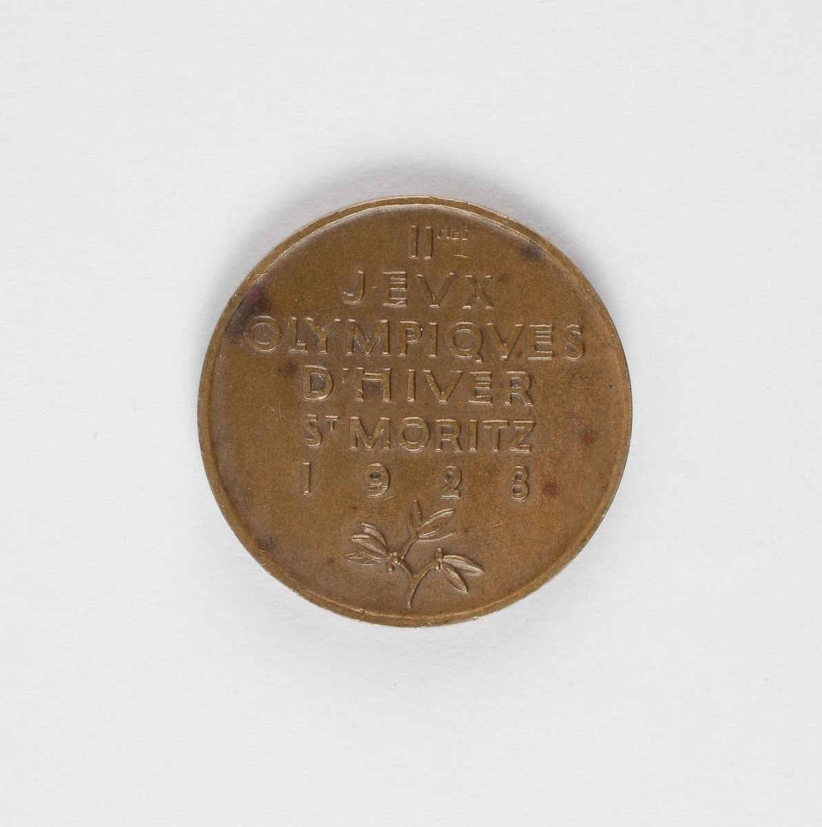 Participation medal issued for the St. Moritz 1928 Winter Olympics. Bronze, 37 mm, 22 gm, by Milo Martin. The front depicts the goddess Victory holding a laurel branch in a horse-drawn sled, with mountains rising in the background and the Olympic rings below; the reverse bears raised text, “II Jeux Olympiques D'hiver St. Moritz 1928,” over a laurel branch. A bold and dramatic example.