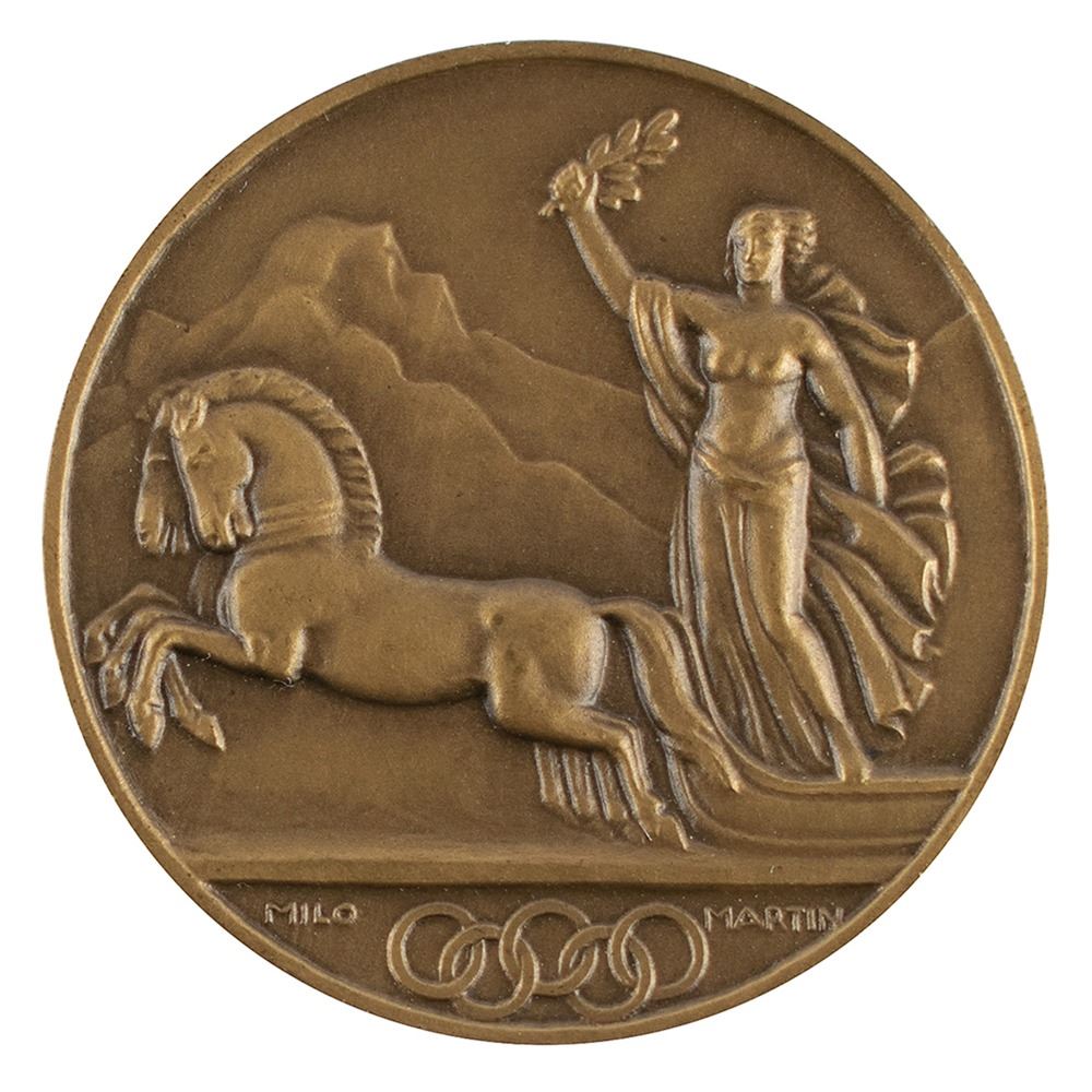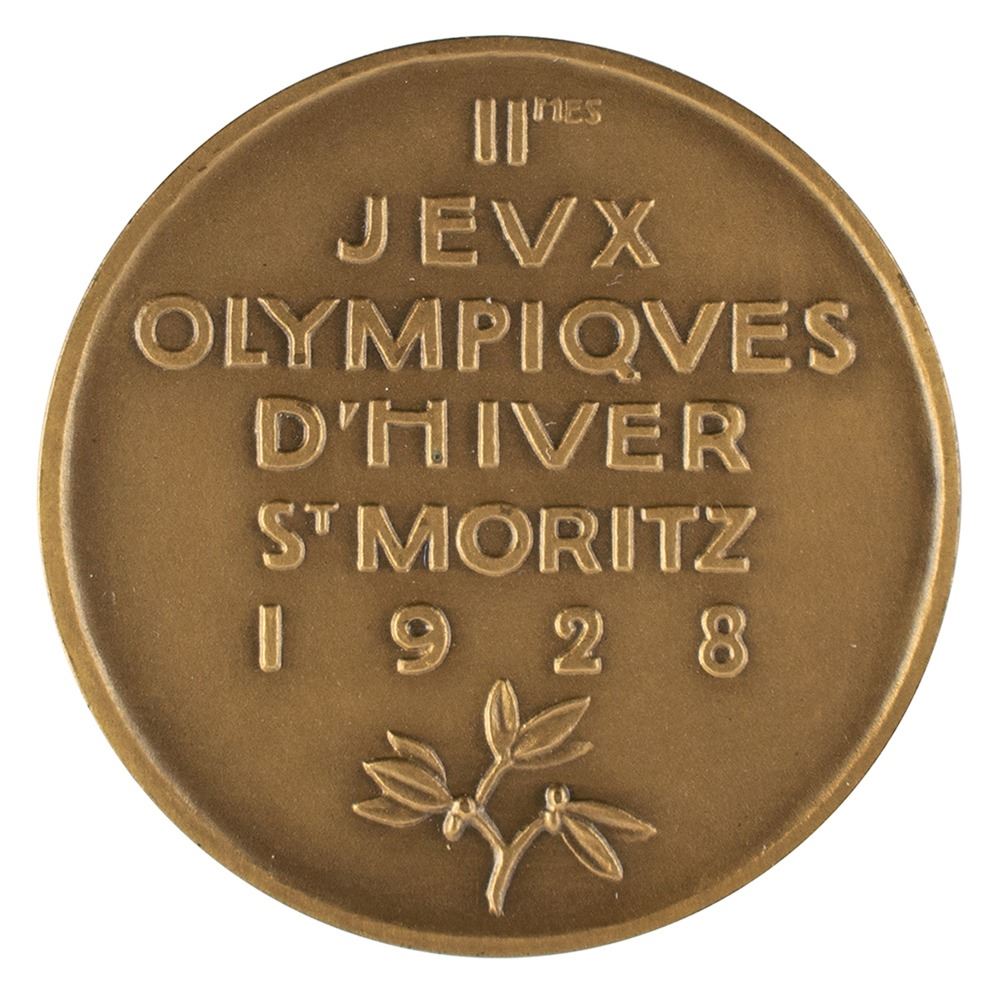 Participation medal issued for the St. Moritz 1928 Winter Olympics. Bronze, 37 mm, 22 gm, by Milo Martin. The front depicts the goddess Victory holding a laurel branch in a horse-drawn sled, with mountains rising in the background and the Olympic rings below; the reverse bears raised text, "II Jeux Olympiques D'hiver St. Moritz 1928," over a laurel branch. A fine example of this small Olympics medal.