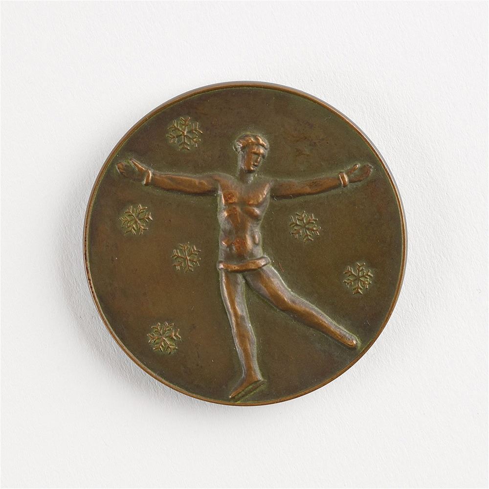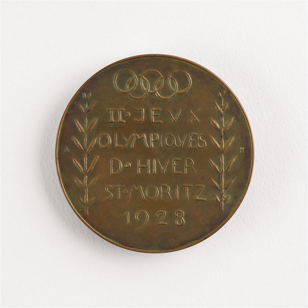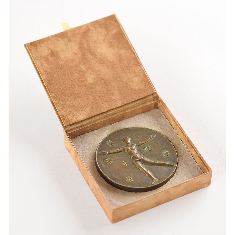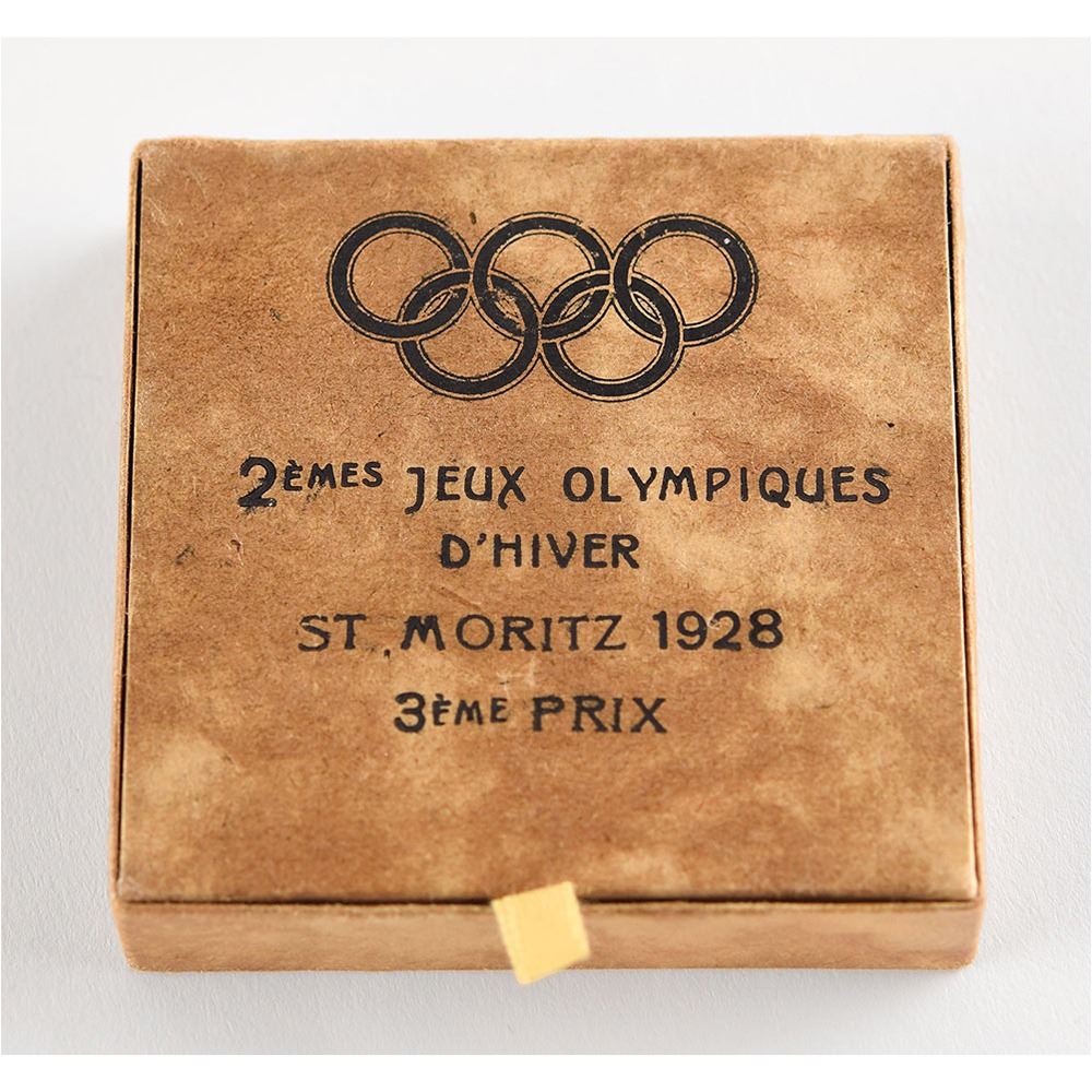 Winner's medal issued for the St. Moritz 1928 Winter Olympics. Bronze, 50 mm, 61 gm, by Arnold Hunerwadel. The appealing front depicts a figure skater surrounded by snowflakes; the reverse reads, "Il Jeux Olympiques d'Hiver, St. Moritz, 1928," with Olympic rings at the top and laurel branches on either side. Complete with its original paper box. The Olympics at St. Moritz were just the second Winter Games held, with only 495 athletes participating. Only 25 bronze medals were awarded at the 1928 Winter Games, and only 80 total winner's medals were presented during the entire proceedings.
