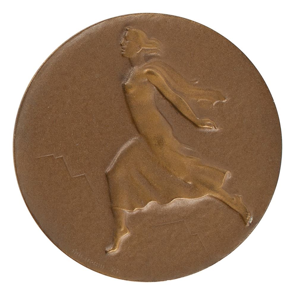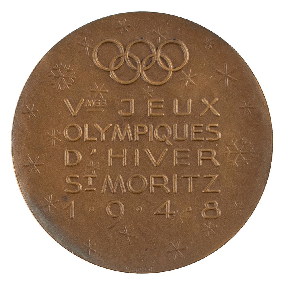 Participation medal issued for the St. Moritz 1948 Winter Olympics. Bronze, 40 mm, 25 gm, by Emil Wiederkehr. The front depicts a symbolic figure of the goddess Victory against a mountain backdrop; the reverse features the Olympic rings above text, "Vmes Jeux Olympiques d'Hiver, St. Moritz, 1948," against a snowflake background.