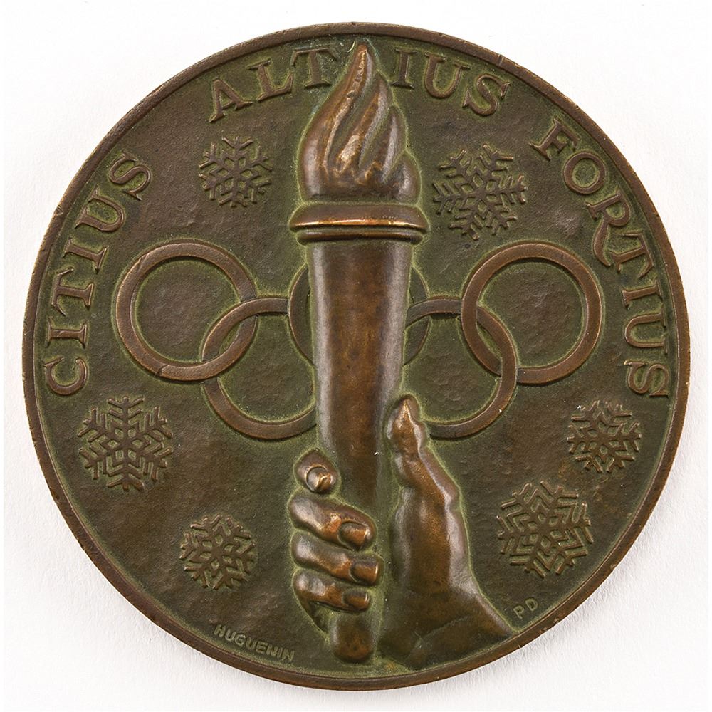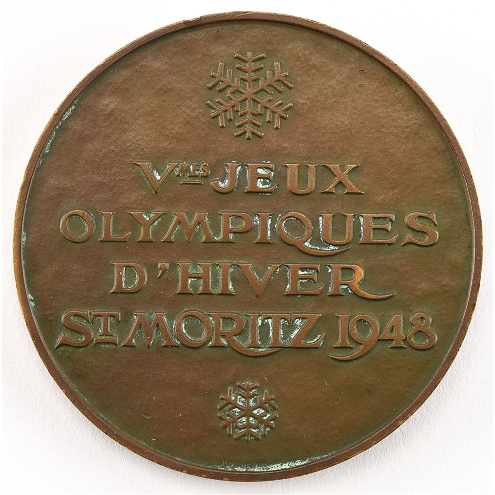 Winner's medal issued for the St. Moritz 1948 Winter Olympics. Bronze, 60 mm, 104 gm, by Paul Andre Droz. The front depicts a hand holding the Olympic torch against a background with snowflakes and Olympic rings, with motto above, "Citius Altius Fortius"; the reverse features two raised snowflakes and the raised text, "Vmes Jeux Olympiques D'Hiver St. Moritz 1948."