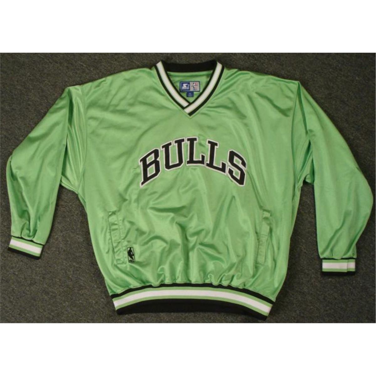 The Chicago Bulls has reached the 60+ win mark for the first time since the Jordan-era and are back in the playoffs, looking better than ever. Here we have an authentic Chicago Bulls St. Patrick Day warm-up pullover. It's from Starter, size XL. It is in lime green with black writing and is in excellent condition. Want to feel like you are actually there, warming up with the team? Then bid on this item today before its too late.