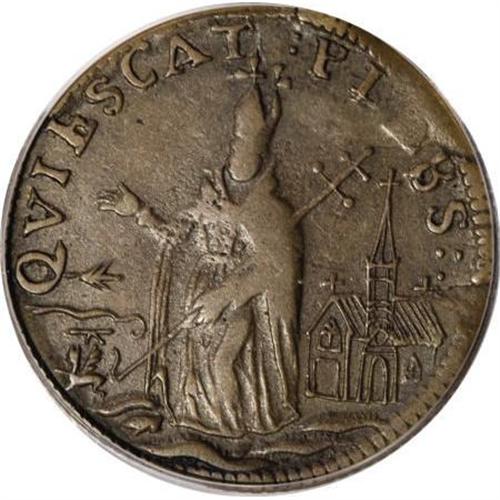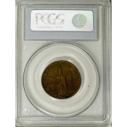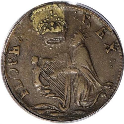 <B>(1670-75) FARTH St. Patrick Farthing AU50 PCGS.</B></I> Breen-212. A "Masonic punctuation" variety with a trio of dots near 3 o'clock on each side. Also a "sea beasts" variety with eel-like creatures at the feet of the harp-playing king. The gold splasher is placed somewhat north but overlaps half of the crown. This chocolate-brown representative is unusually smooth and bold for the series. Listed on page 39 of the 2008 <I>Guide Book</B></I>. Population: 3 in 50, 5 finer (12/07).<BR><BR><b>Shipping:</b> Coins & Currency (<a target="_blank" href="http://www.heritageauctions.com/common/shipping.php">view shipping information</a>)