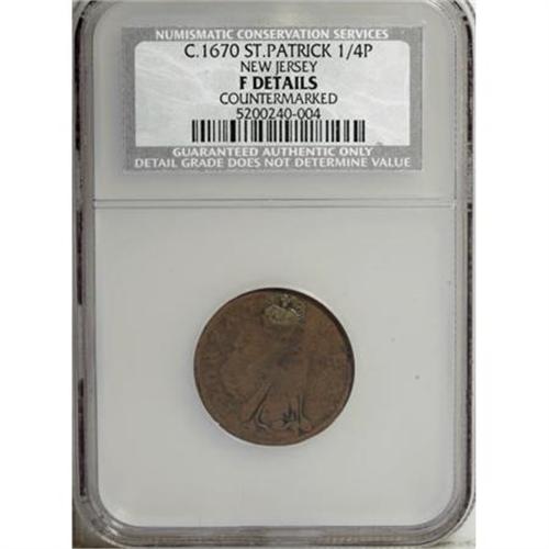 <B>(1670-75) FARTH St. Patrick Farthing--Countermarked--NCS. Fine Details.</B></I> Breen-208. The brass splasher is slightly high, but mostly overlaps the crown. Large TT initials are entered on the reverse, horizontally placed relative to St. Patrick, and located across his chest and headwear. The right-side reverse border is worn. Listed on page 39 of the 2008 <I>Guide Book.</B></I><BR><BR><b>Shipping:</b> Coins & Currency (<a target="_blank" href="http://www.heritageauctions.com/common/shipping.php">view shipping information</a>)