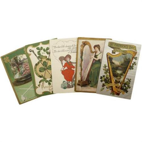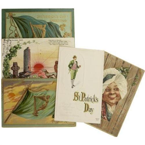 <B>St. Patrick’s Day Vintage Color Postcard Lot</B></I>. A group of ten postcards, circa early 20th century, with Irish and St. Patrick’s Day themes, with the obvious central green color prominent and featuring among other icons, the flag of Erin, harps, caricatures of Irish people, clay pipes, etc. Most have been posted, a few have mounting remnants on the verso, else in very good condition or better. <BR><BR><BR><b>Shipping:</b> Flat Material, Small (<a target="_blank" href="http://www.heritageauctions.com/common/shipping.php">view shipping information</a>)