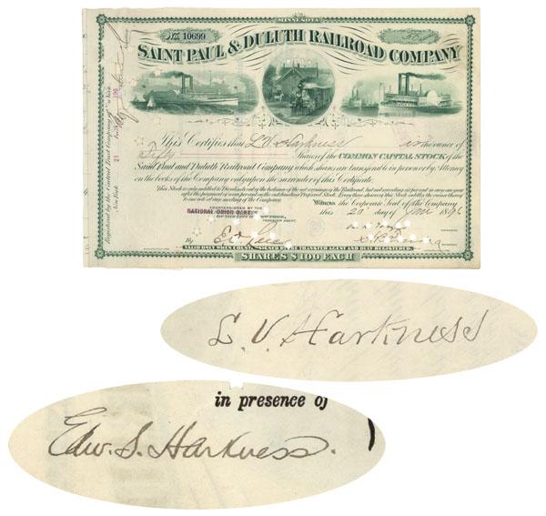 1896, Minnesota. Stock certificate for 50 shares. Green. Very attractive certificate with a large triple vignette at top of a steam locomotive flanked by two steam ships. Issued to and signed on verso by Lamon Vanderburgh Harkness (1850 - 1915) American businessman and a partner in Standard Oil who was one of the company's largest stockholders. Witnessed by Edward Stephen Harkness (1874 - 1940) American philanthropist. He was born in Cleveland, Ohio, one of three sons to Stephen V. Harkness, a harness-maker who invested with John D. Rockefeller and became the second-largest shareholder in Standard Oil. Hole punch cancellations not affecting either Harkness' signatures. Very Fine.