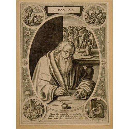Beautiful engraving of Saint Paul, in his old age, writing. The text on the page reads in Latin as follows: S. Paulus. Phls. Galle excud. Admone illos principibus et potestatibus subditos esse, dicto obediere, ad omne opus bonum paratos esse. Epistola Pauli ad Titum capite 3. Good early impression on paper (undated but have found references to the Phls. Galle placing them in Amberes between the years 1500 and 1600). Trimmed just outside the platemark. Please ask questions, request additional photos and shipping costs before buying.