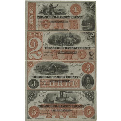 <B>St. Paul, MN- Treasurer of Ramsey County </B></I>$1-$2-$3-$5 18__ Rockholt 36-37-38-39 Uncut Sheet<BR> We have handled only one other sheet and a single note on this issuer in the past. The sheet brought over $3600 after contested bidding. This remainder sheet has folds between the notes plus a little more handling and a couple of pinholes. <B>Extremely Fine.</B></I><BR><BR><b>Shipping:</b> Coins & Currency (<a target="_blank" href="http://www.heritageauctions.com/common/shipping.php">view shipping information</a>)