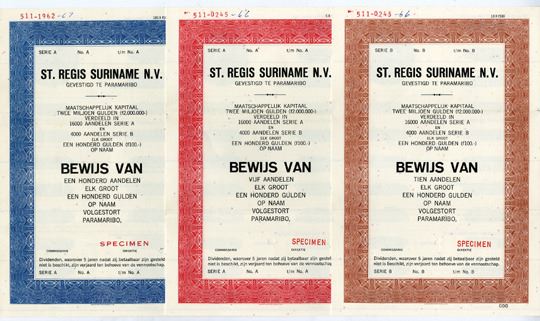 St. Regis Suriname N.V., 1966-67, Trio of Specimen Certificates