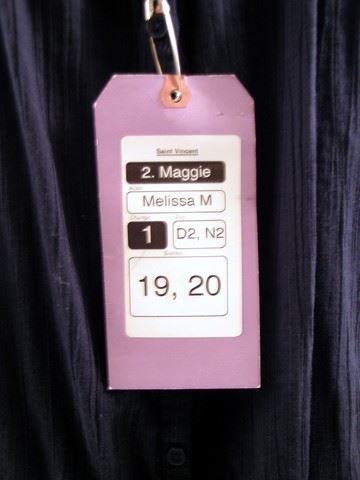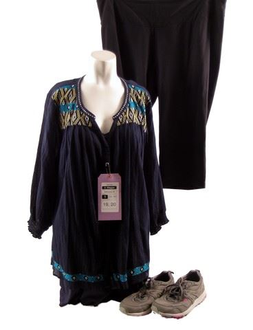 Maggie (Melissa McCarthy) screen worn, hero, navy blue cotton crepe with yellow, turquoise, and white embroidery trim 'Lucky Brand' blouse, navy cotton soft slight v-neck with built extension 'Charter Club' top, black yoga capri length wide elastic band 'Style & Co' pants, and grey laced track with pink accents 'Olukai' sneakers. (size 8) Includes wardrobe tag!