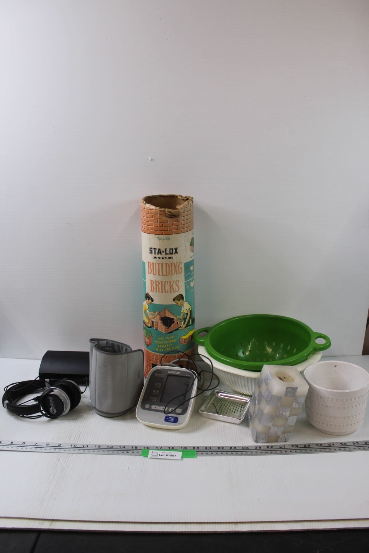 Sta-Loz Mini Building Blocks Set - as is, Headphones, (2) Plastic Strainers, Planter, Blood Pressure