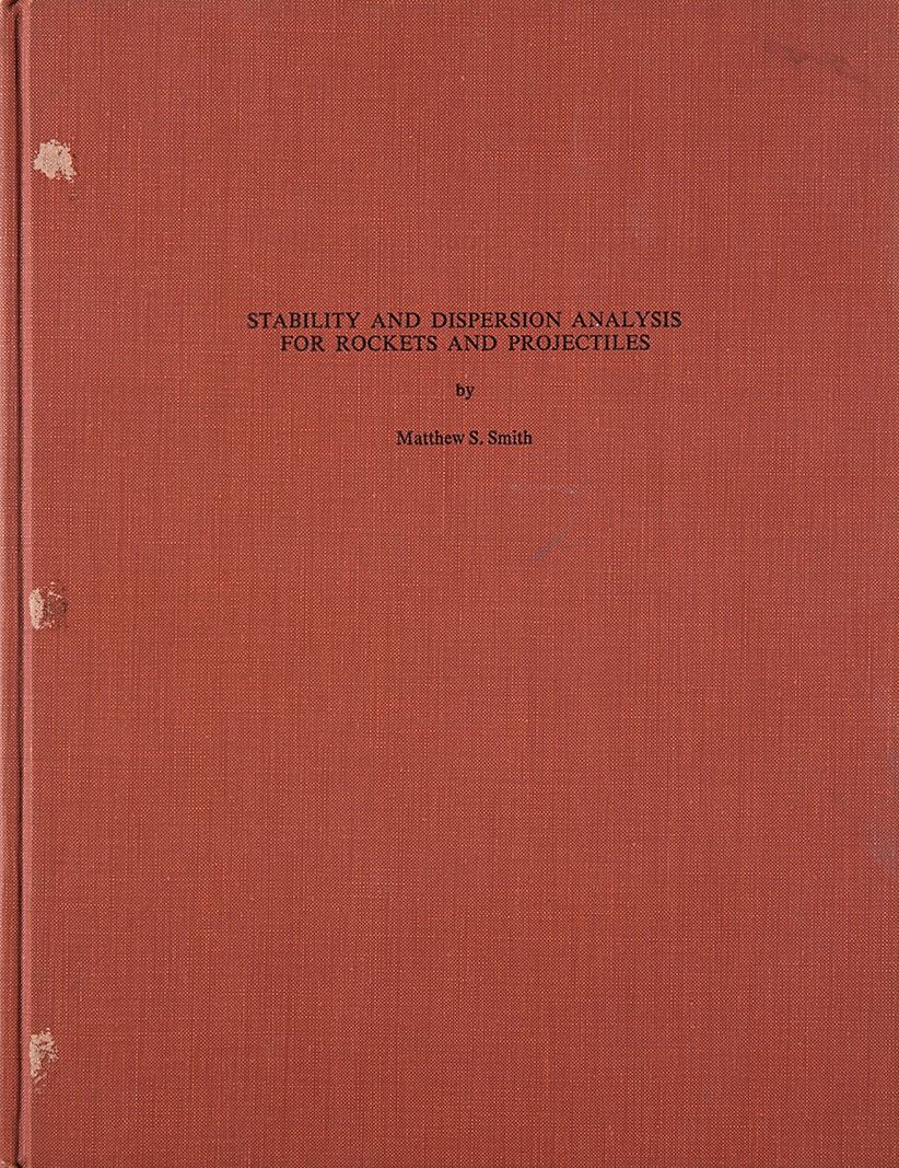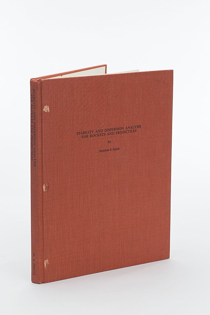 Uncommon book: Stability and Dispersion Analysis for Rockets and Projectiles by Matthew S. Smith. Privately printed, 1970. Hardcover, 8.75 x 11.25, 164 pages. The book's chapters are entitled: "Aerodynamic Forces and Movements," "Aerodynamic Coefficients," "Fin Stabilized Rockets and Projectiles," "Spin Stabilized Rockets and Projectiles," "Aero-Gyro Stabilized Rockets and Projectiles," "Launch Effects on the Dispersion of Pre-Spun Rockets," and "Stability Analysis with Thrust." In very good to fine condition, with three scuffs to the left edge of the front cover.