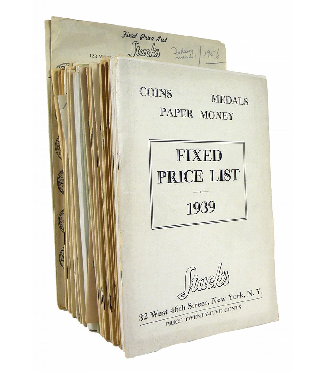 Stack's. FIXED PRICE LISTS. New York, 1939-70. A nearly complete set through 1970, including Nos. (1)-12, 12-A, 14-34, 35, 35-A, the 22-page version of No. 36, 37, 38, 40-44, 44-A, 45-51, 53-66, 66-A, 67-A, 68, 69 (both original card cover variants), and 70-76. Seventy-eight catalogues total. Varying formats, mostly self-covered, some earlier ones two-hole punched as issued. Overall condition very good to fine. Rather modestly produced for the most part, the scarce early fixed price lists were an important commercial vehicle for Stack's and are of considerable interest. List 9 offers 271 "U.S. Large Cents From 1793 to 1857 With Important Die Varieties"; list 14 features 831 "U.S. Large Cents From 1793 to 1857 With Important Die Varieties From the A.C. Gies Collection." The latter was catalogued by teenaged numismatic tyro John J. Ford, Jr. and exhibits a penchant for detail that would later propel him to the front ranks of commercial American numismatics. Catalogue 12-A, a well-produced catalogue of Choice Ancient Gold Coins, is accompanied by two photographic plates that are rarely encountered. Essentially complete for the time period. Ex Michael Spurlock library.