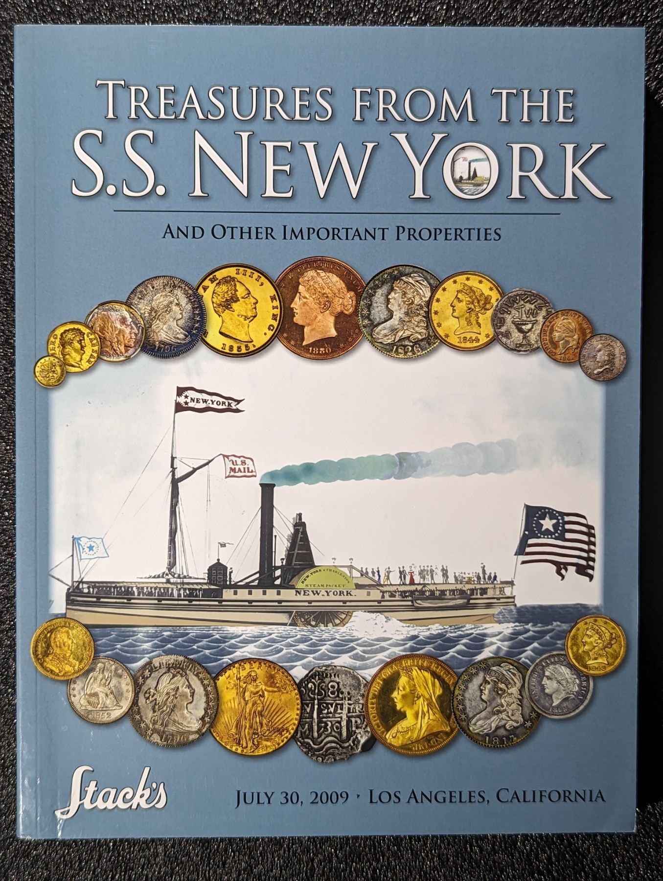 Stack's. TREASURES FROM THE 'S.S. NEW YORK' AND OTHER IMPORTANT PROPERTIES. July 30, 2009. 4to. 1-954, 1001-1569, 2001-2526 Lots. Original pictorial card covers. Public Auction Sale. Los Angeles. 372 Pages. color coin, currency and antiquities photos throughout. Fine. This auction sale catalog includes numismatic material from the United States, Ancient Greece, Rome, and the Byzantine Empire, Europe, and other countries with the main focus on coins of the United States and lots coming from the wreck 'S.S. New York'. The sale includes 125 lots from the 'S.S. New York' (sank 1846 off the coast of Louisiana), including 32 US gold coins, 2 copper US coins, 4 silver US coins, 36 European gold coins, 36 artifact groups, 6 pieces of silver tableware, and 7 bottles. There is a 2 page description of the wreck and salvage. The sale also includes selections from the Evan L. Kopald Collection of Large Cents, The Chet Krause Collection, and The Richard Gross Collection. Lot weight: 2 lbs 11oz. Subject(s): Ancient, United States, British, European Coinage, Paper Money, Antiquities.