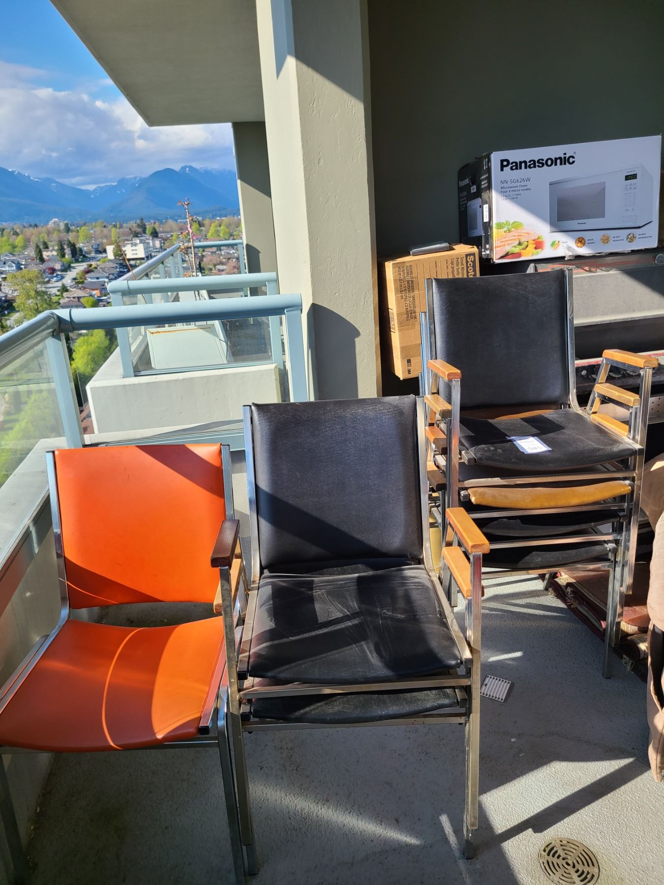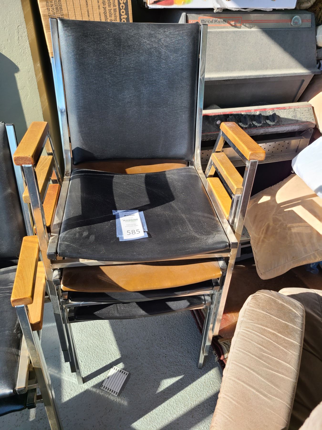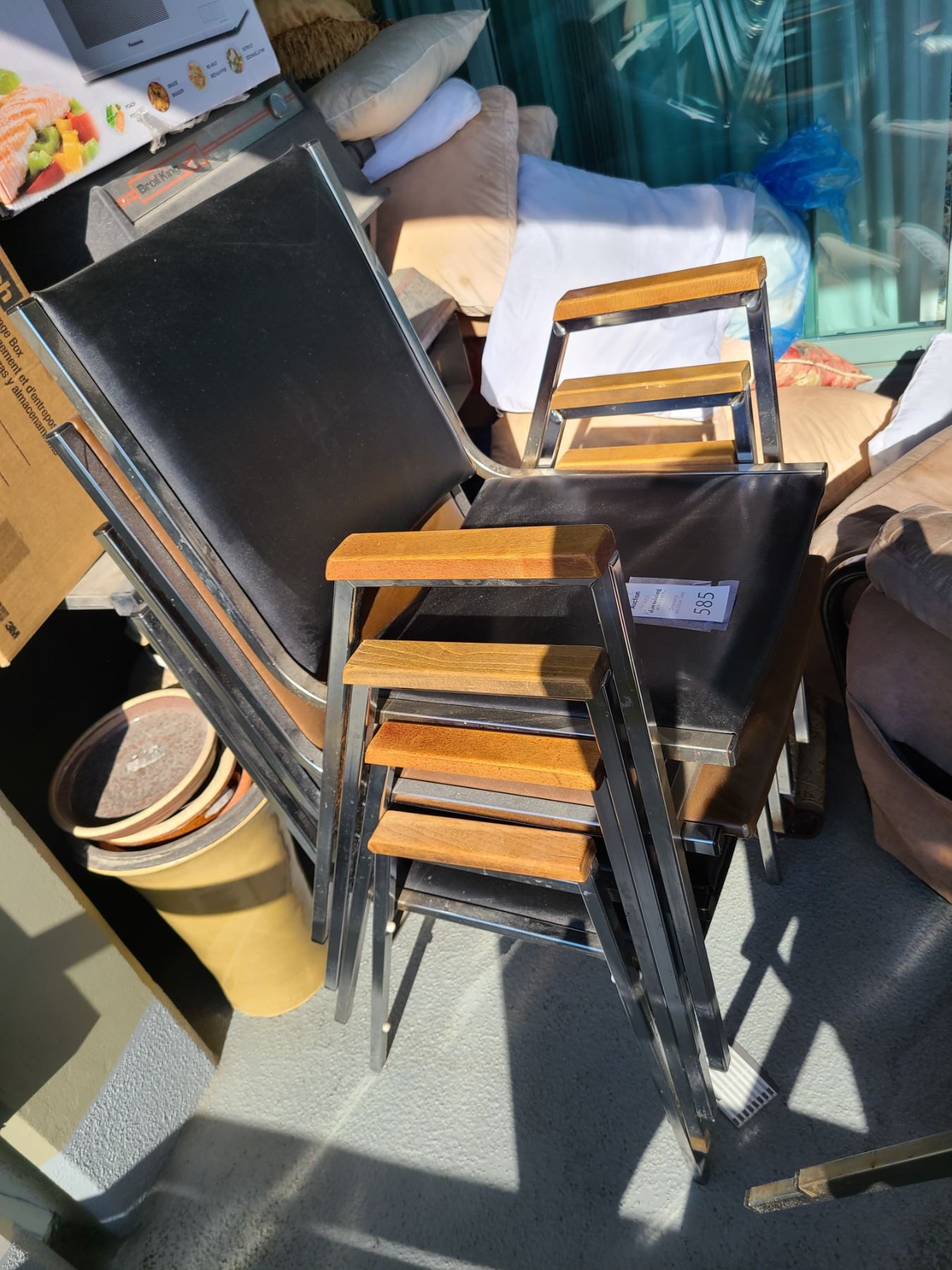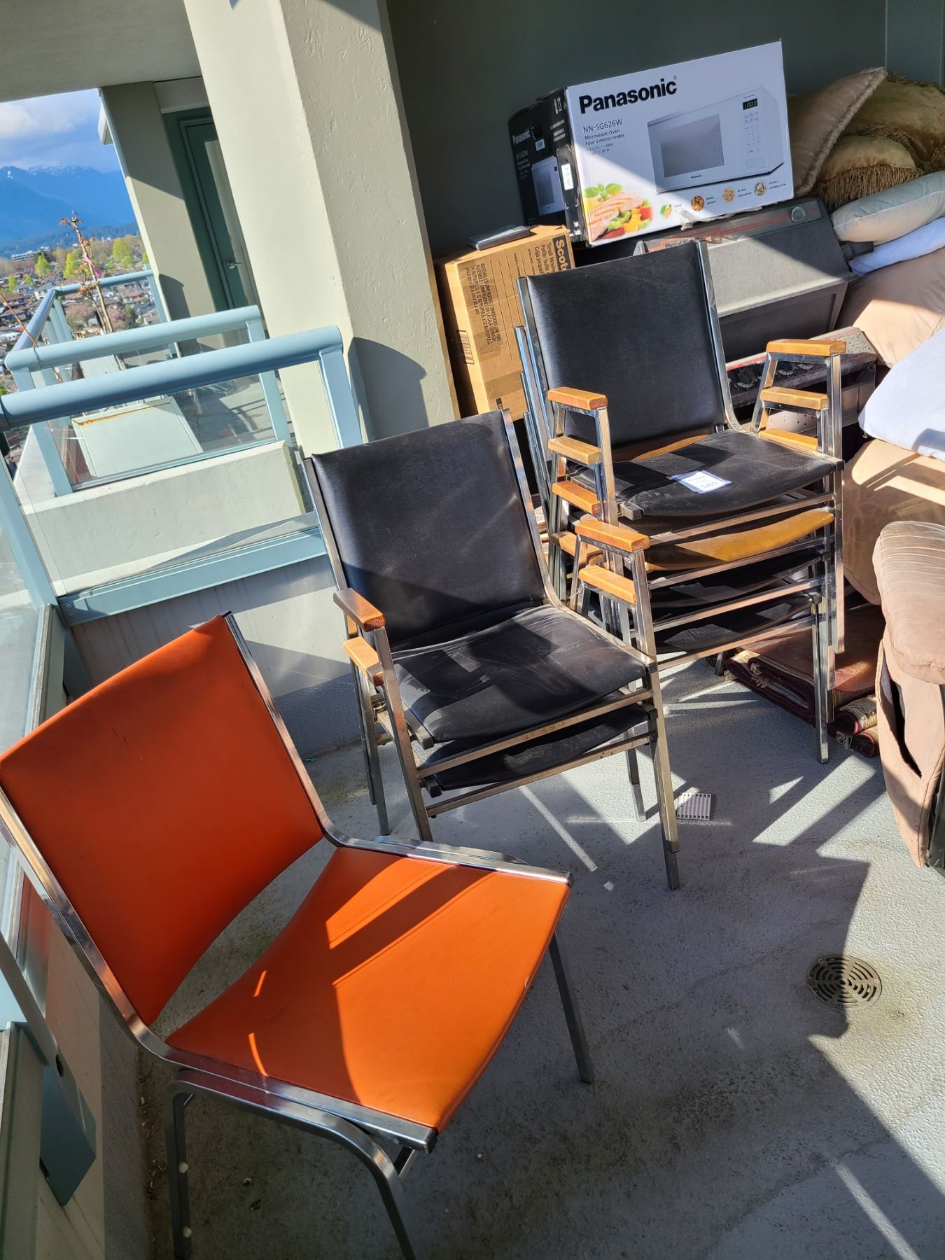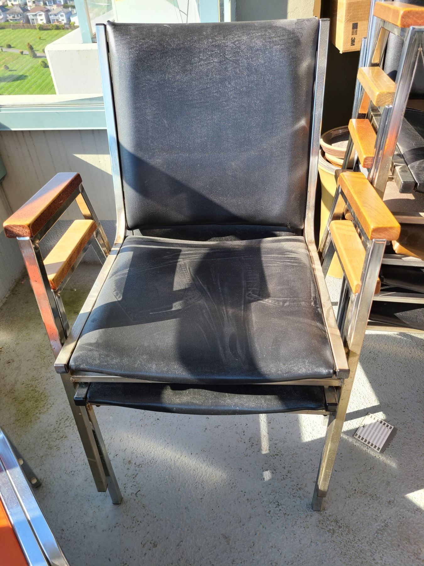 7 vinyl & metal stacking chairs. Heavy bring help to remove & pickup at 10 am