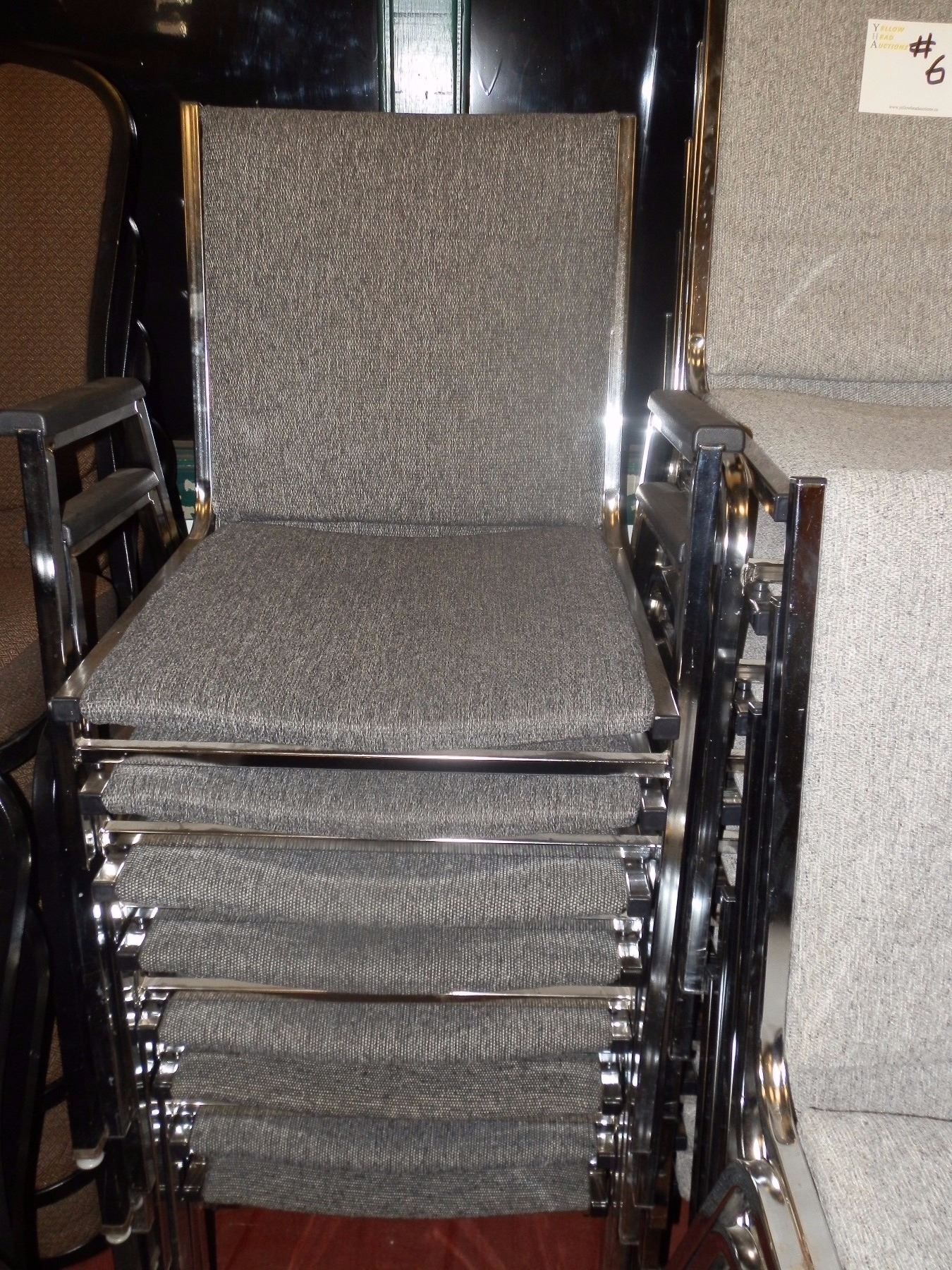 8 chrome tubed framed dark grey fabric stacking chairs used