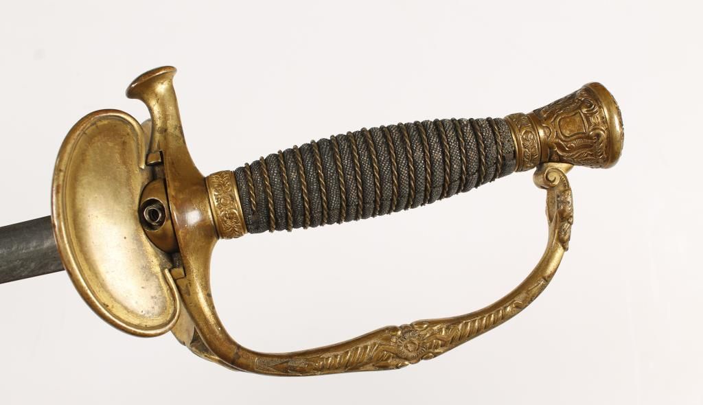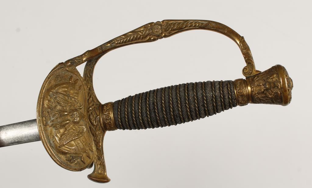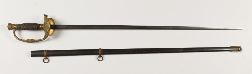 Faint trace of etching remains on blade, including scrollwork design and American eagle. Ornate hand guard with American eagle. Also has guard plate with a spring underneath. American eagle on pommel, black textured grip with wire wrapping. Approx 36-1/2" with 30-1/2" blade. Includes sheath with brass hook attachments and tip protector. Dark patina with some surface rust, approx 32" overall.