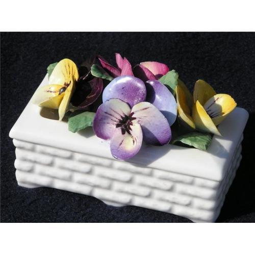 This wonderful miniature window box is full of lovely posies. With bright vivid colors the pink, violet and yellow just glow above the creamy white window box. I've seen these used at paperweights (it does have some weight to it) or just being beautiful on a shelf. It measures 3 ½" long by 2 ¼" high and is in perfect, mint condition.
