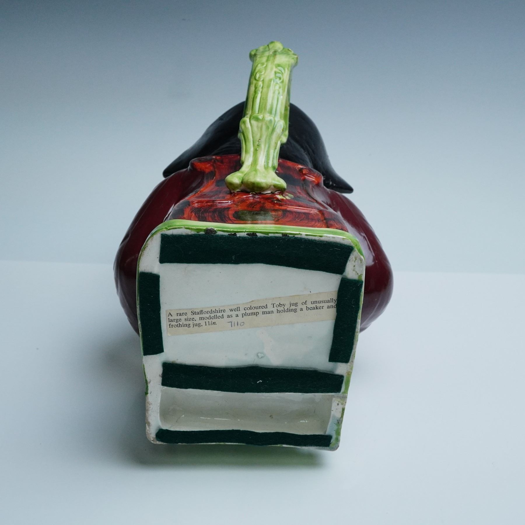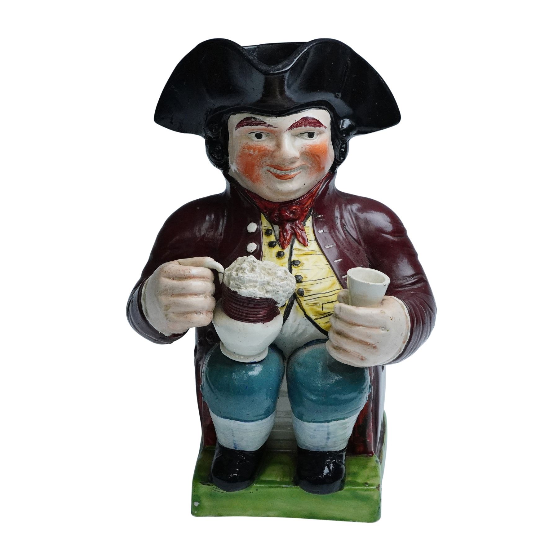 This impressive large Staffordshire Toby jug, known as the Coachman, showcases a wonderfully bold and colorful presence with its richly glazed deep red coat, bright yellow waistcoat, and vivid green base and handle. Modeled as a plump, cheerful man holding a frothing jug and a beaker, this piece exudes character and charm from every angle.