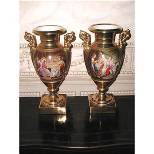 Pair of C.1890 heavy Staffordshire pottery bulbous trumpet shaped vases from England are hand painted in vibrant colors on the one side,gold on gold design on the other. Beautiful gold rims and ornate double handles. Excellent condition,no chips,cracks or nicks as well as loss of paint. No markings,yet the detailed scenes,paint used and pottery quality are unmistakably Staffordshire. Measure 17H X 9L X 7D each. Price is for pair.