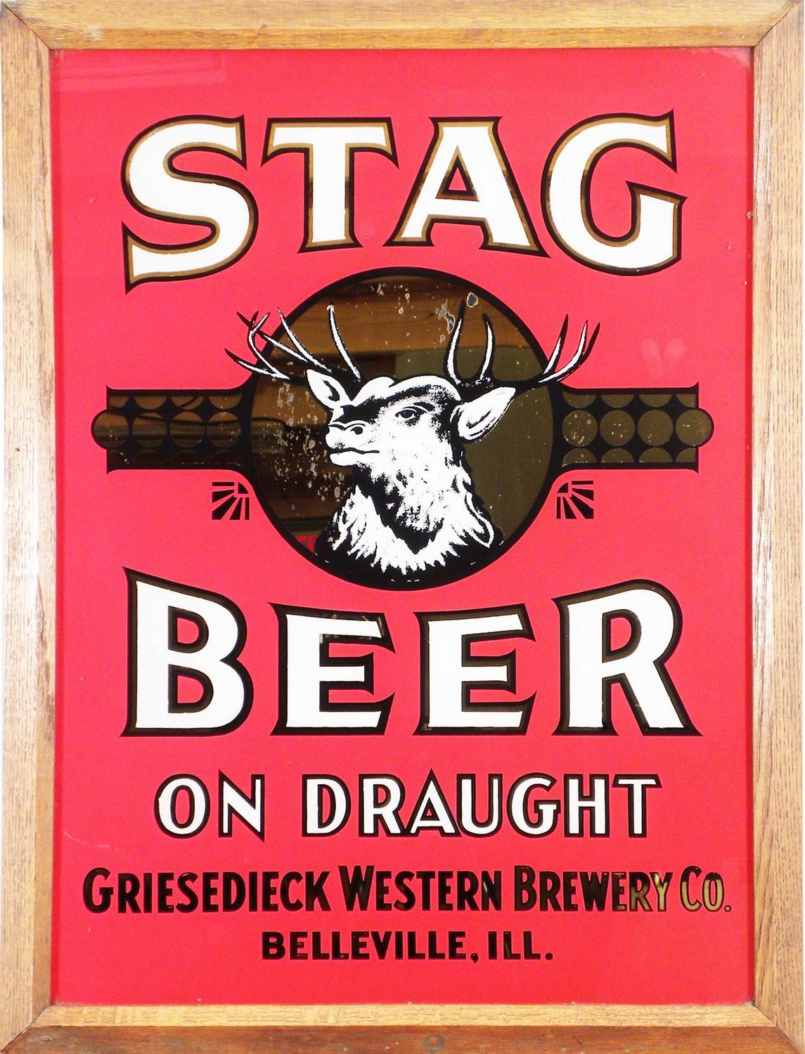 Stag Beer Reverse Glass Sign. Griesedieck Western Brewery Co. Belleville, ILL. Some minor lifting in the gold otherwise excellent condition. 20 X 26 inches overall.