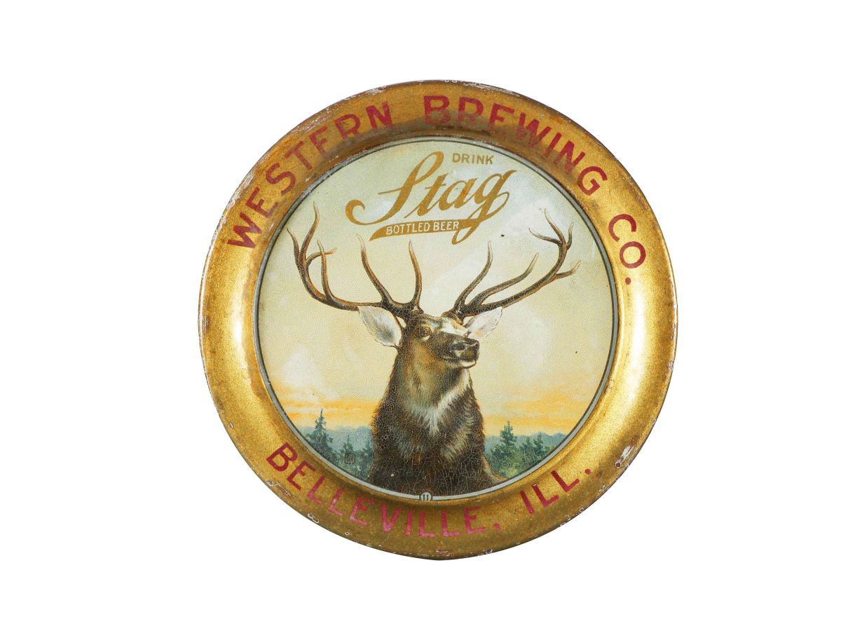 Stag Beer Tin Tip Tray. Western Brewing Company, Belleville, Ill. Minor dents and discoloration, slight edge ware, fair to good condition. 4 1/4 inch diameter.