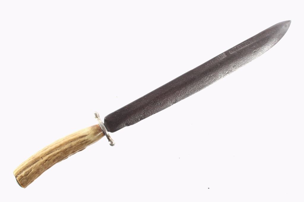 You are bidding on a great example of a Stag Handled Heavy Frontier Fighting Knife. The knife features a 9 3/4" blade, 1/4 thick spine, reinforced spear point, and German silver guard and grip cap. The knife shows a very deep and dark aged patina. This has a great look and an impressive 14" overall length. The blade is marked "Wilson Cast Steel."