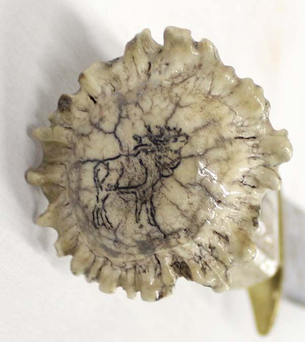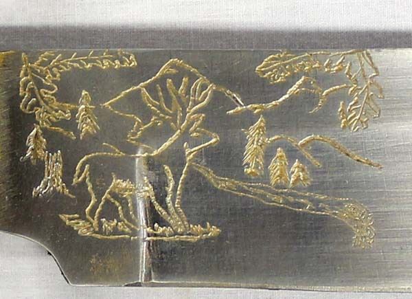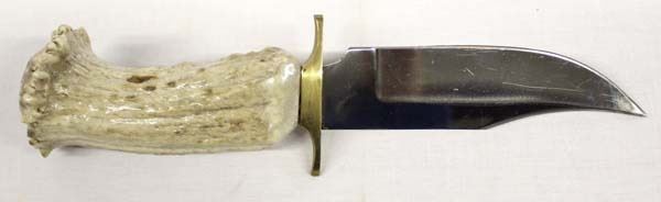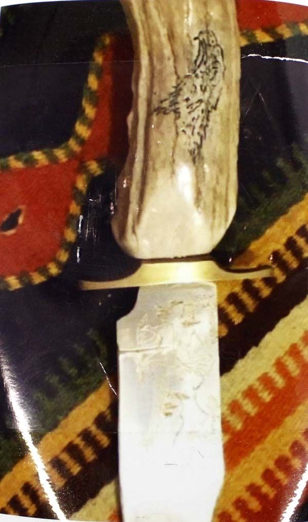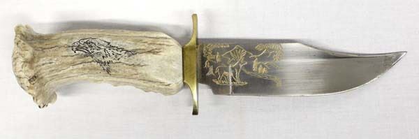 Stag Handled Knife with Engraved Blade, total length of 11''L x 2.5'', blade measures 5.75'' x 1.5'', brass hilt, there is an eagle etched into one side of the antler, a stag etched on the end of the antler (bottom of handle) and a stag etched onto one side of the blade, truly a work of art