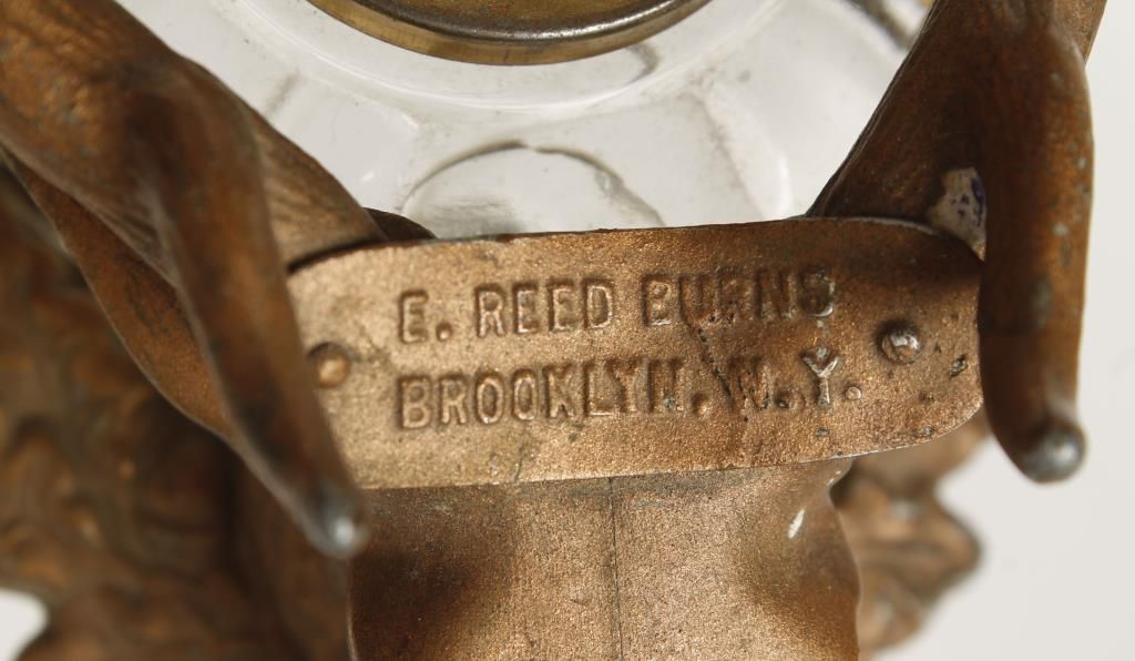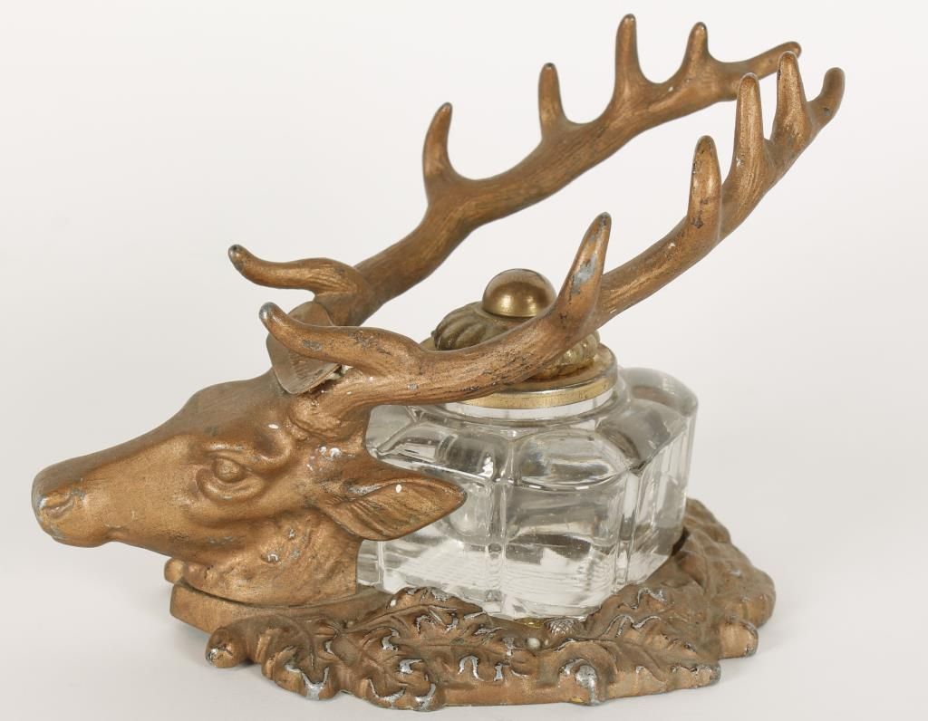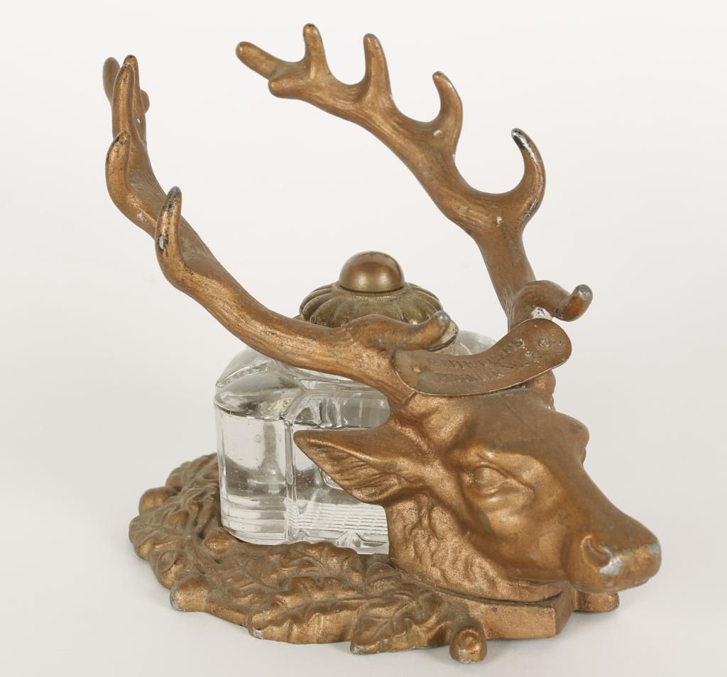 Featuring a stag head on wreath base. Marked "E. Reed Burns Brooklyn, N.Y." With glass insert and pen marked "97 E. Faber U.S.A." The ink well is in overall good condition.